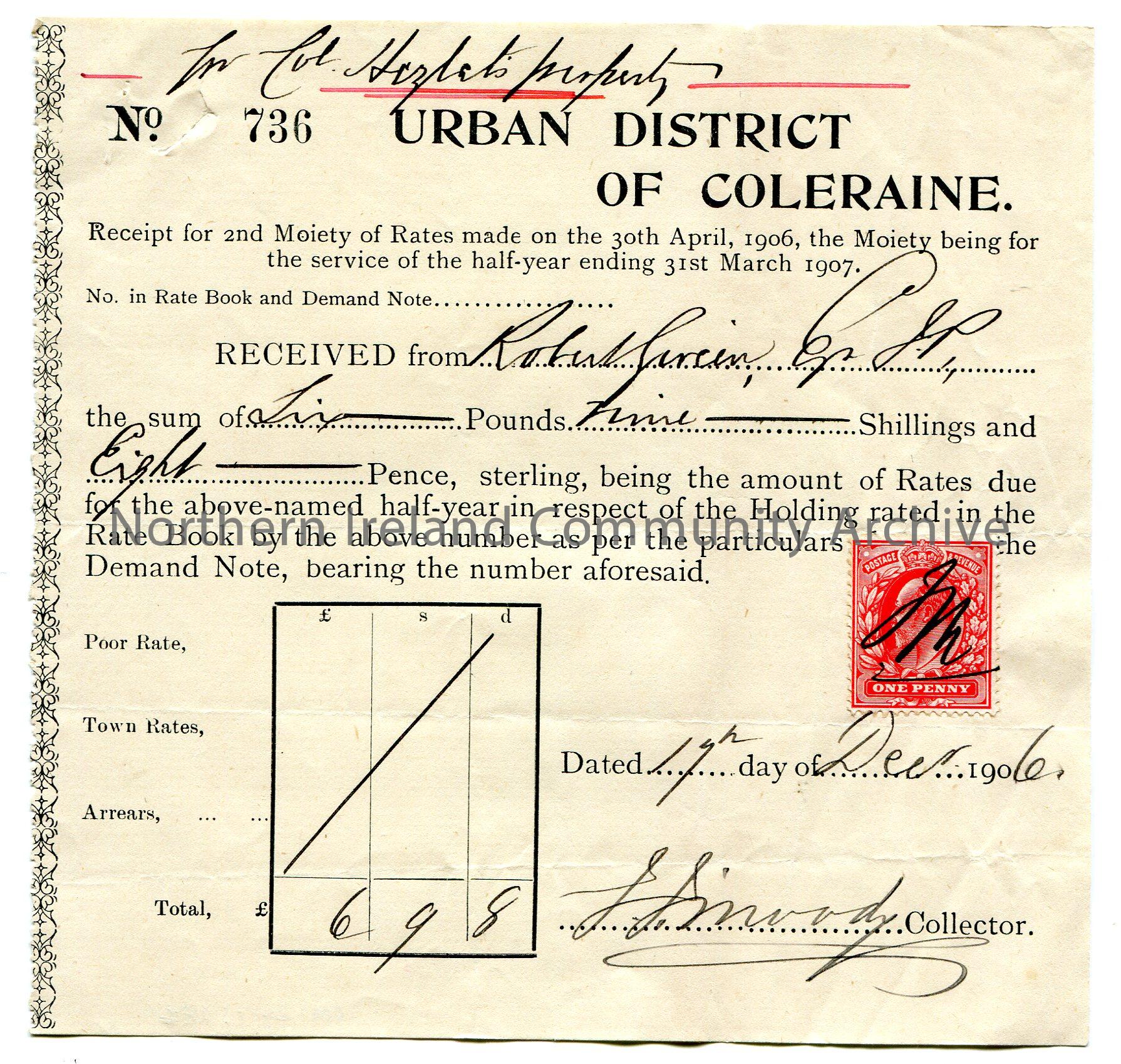 Handwritten receipt, No. 736, for half yearly rates for Col. Hezlett's [Hezlet] property. Payment of £6.9.8 received from Robert Giveen, Esq. Dated 17th December, 1906. Signed by J J Moody, Collector. Red one penny King Edward VII postage stamp on right side of receipt.
