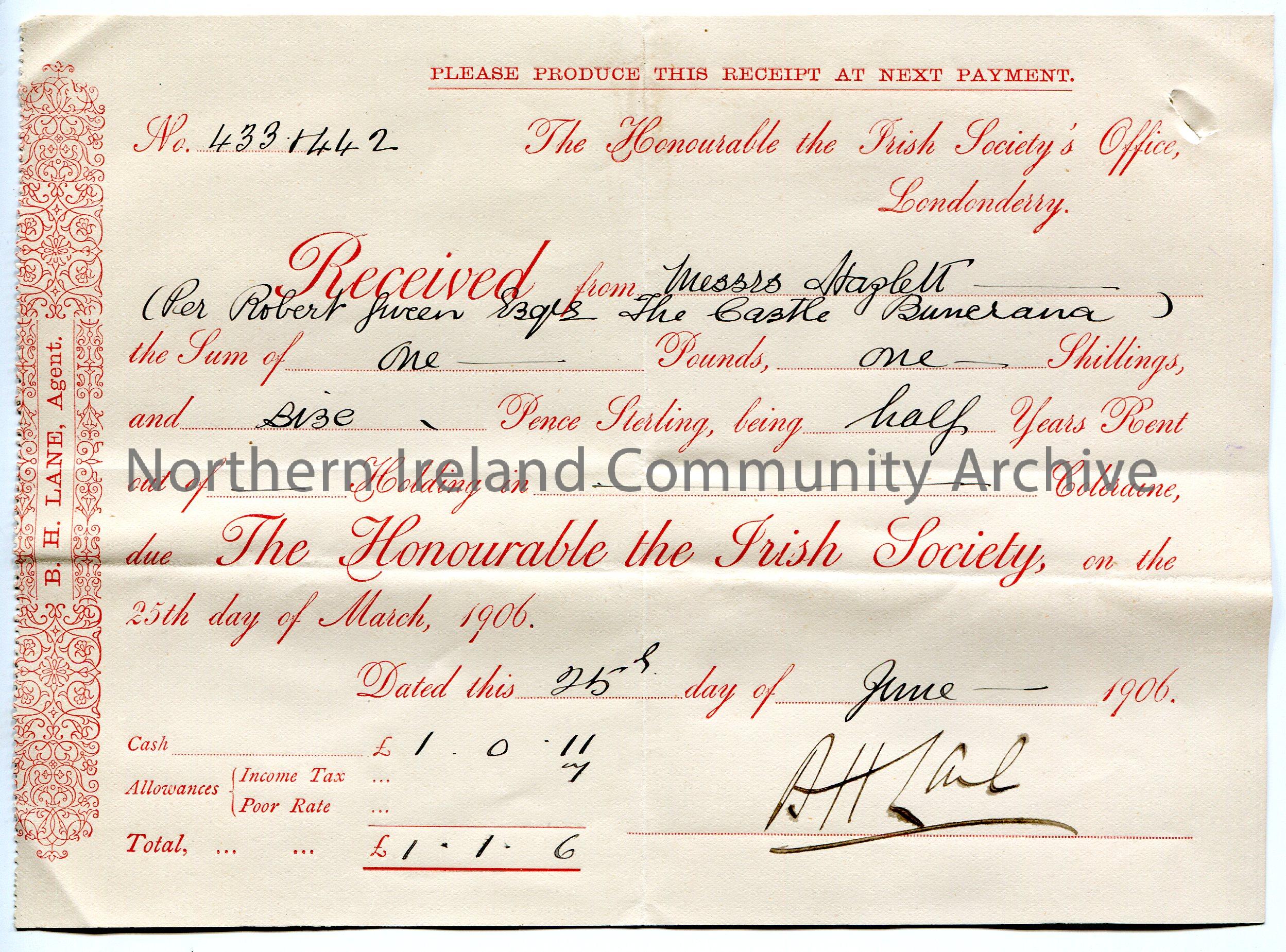 Handwritten receipt, nos. 433 and 442, for the sum of £1.1.6 paid by Messrs Hazlett [Hezlet] per Robert Giveen, Esq, The Castle Buncrana. Payment for half yearly rent. Money due to The Honourable The Irish Society. Dated 25th June, 1906. Signed by B H Lane, Agent.