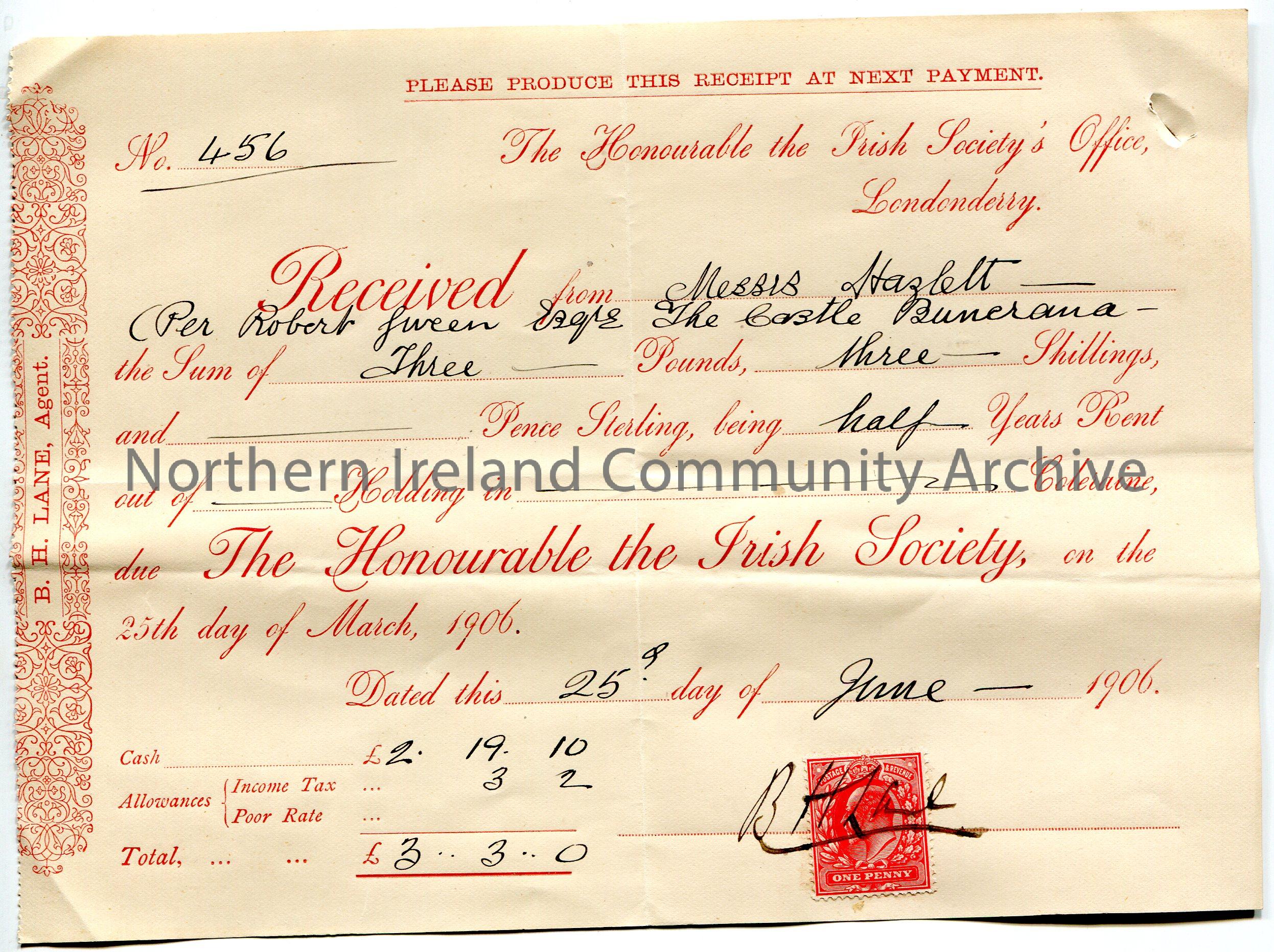 Handwritten receipt, nos. 456, for the sum of £3.3.0 paid by Messrs Hazlett [Hezlet] per Robert Giveen, Esq, The Castle Buncrana. Payment for half yearly rent. Money due to The Honourable The Irish Society. Dated 25th June, 1906. Signed by B H Lane, Agent. Red one penny King Edward VII postage stamp on bottom right corner.