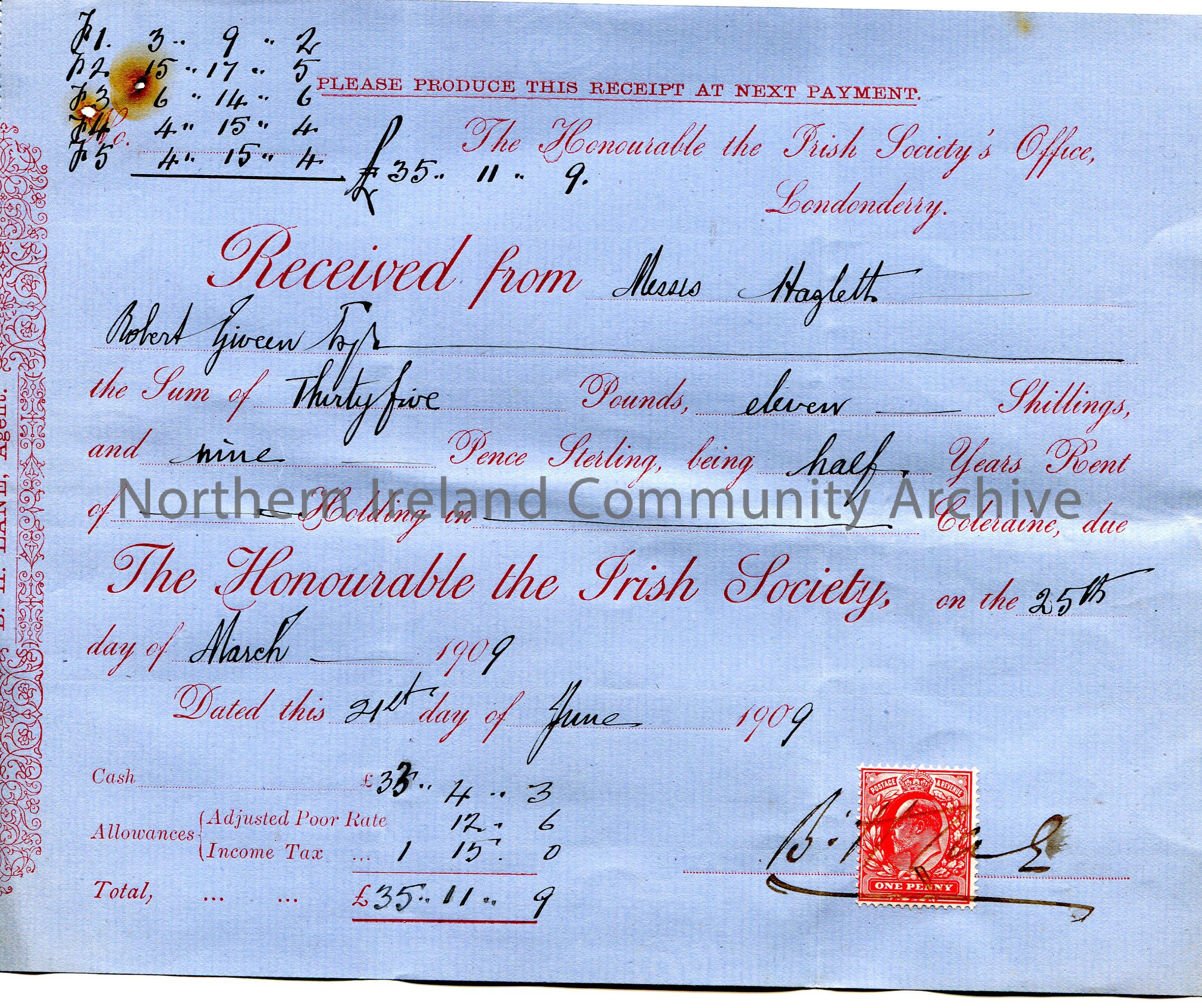 Handwritten receipt (on blue paper). Payment of £35.11.9 to The Honourable The Irish Society from Messrs Hazlett [Hezlet] per Robert Giveen on 25th March, 1909. Receipt dated 21st June, 1909. Red one penny Edward VII stamp bottom right corner.