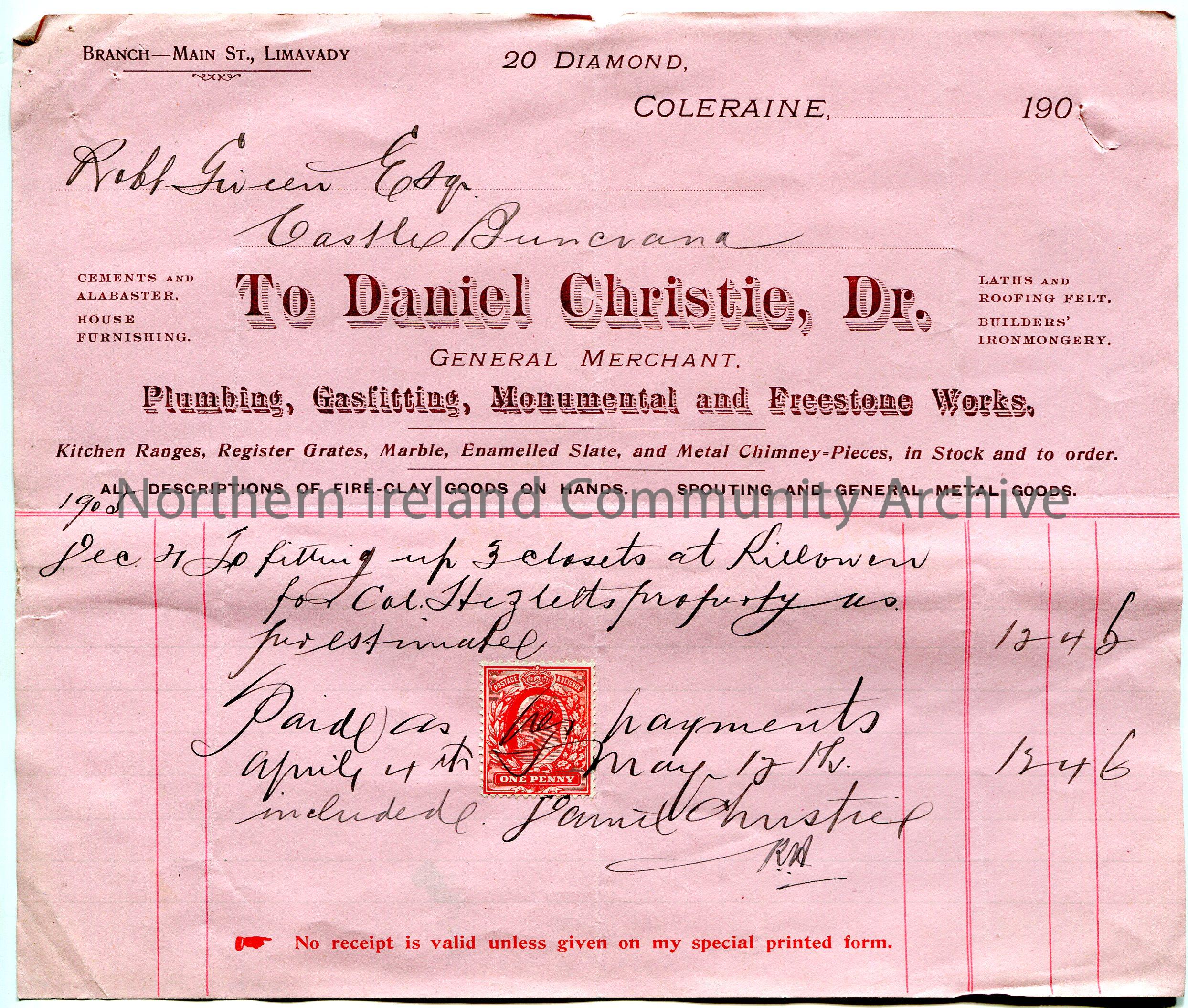 Handwritten receipt Robt [Robert] Giveen Esq., Castle Buncrana for payment to Daniel Christie, General Merchant, 20 Diamond, Coleraine. For 'fitting up 3 closets at Killowen for Col. Hezlett's [Hezlet] property as per estimate' on 11th December, 1905 for the sum of £12.4.6. Red King Edward VII postage stamp stuck to page.