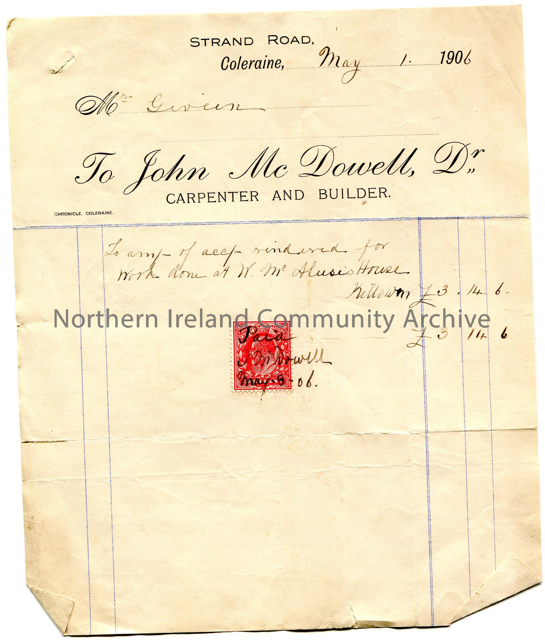 Handwritten receipt to Mr Given from John McDowell, carpenter and builder, Strand Road. Receipt dated 1st May, 1906. For work at W. McAlusis? house, Killowen. The sum of £3.14.6 paid on 8th May, 1906. Red King Edward VII postage stamp in middle of receipt. 'McDowell May 9 06' handwritten on back of page.