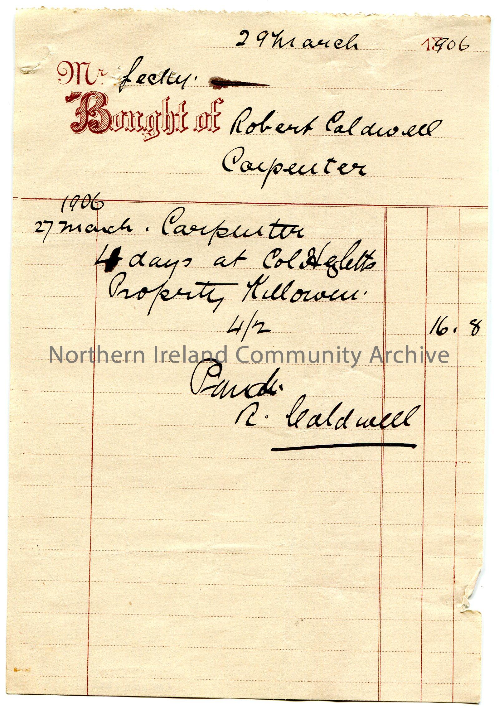 Handwritten receipt to Mr Lecky for the services of Robert Caldwell, carpenter - 4 days at Col Hezlett's [Hezlet] property Killowen on 27th March, 1906. Payment of £0.16.8 received. Dated 29th March, 1906.