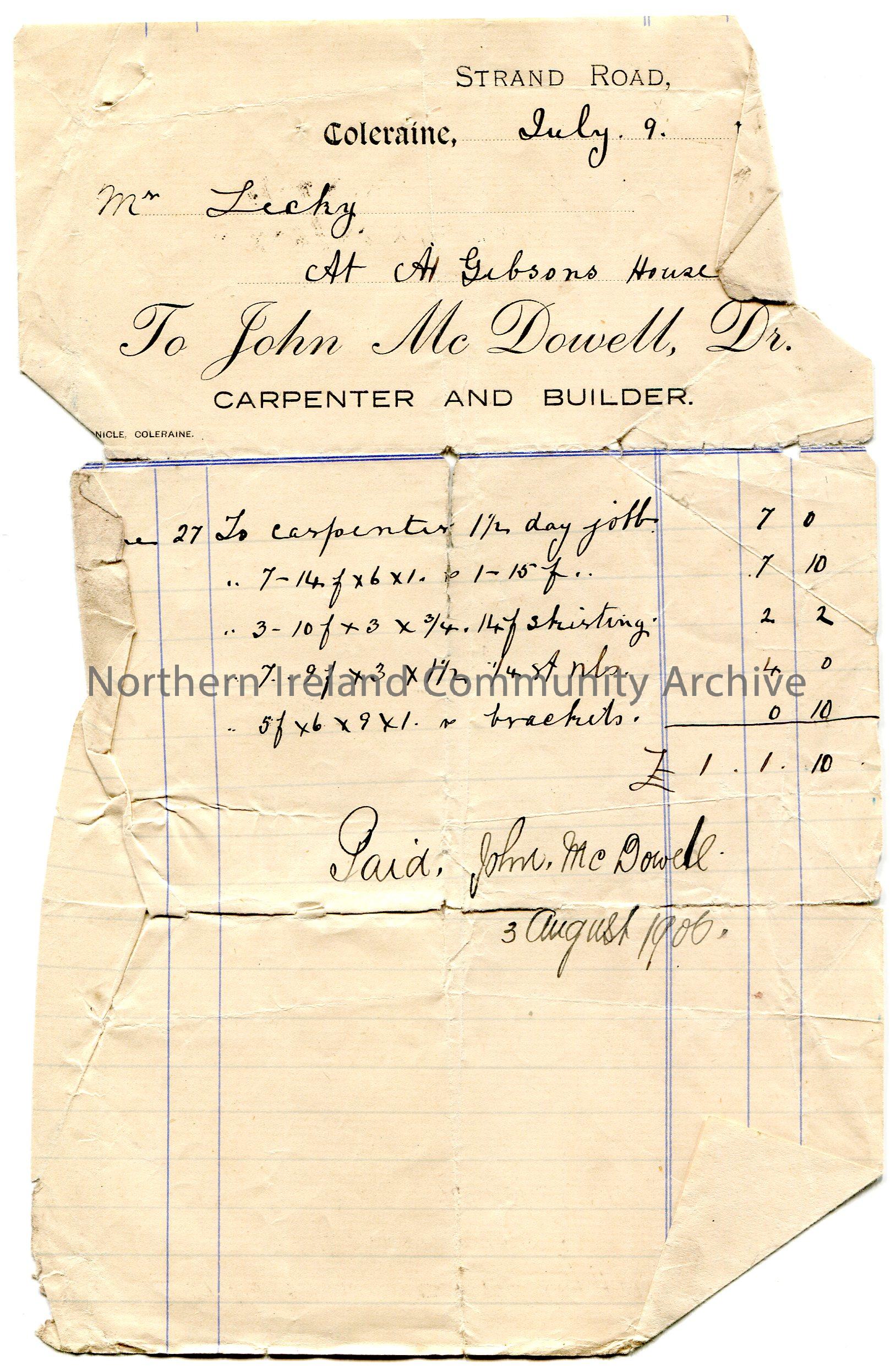 Handwritten receipt to Mr [Samuel] Lecky 'At Gibsons House' for payment to John McDowell, carpenter and builder, Strand Road, Coleraine. Receipt dated 9th July, 1906. For work carried out on 27th June 1906 to the sum of £1.1.10. Paid on 3rd August, 1906. Signed John McDowell.