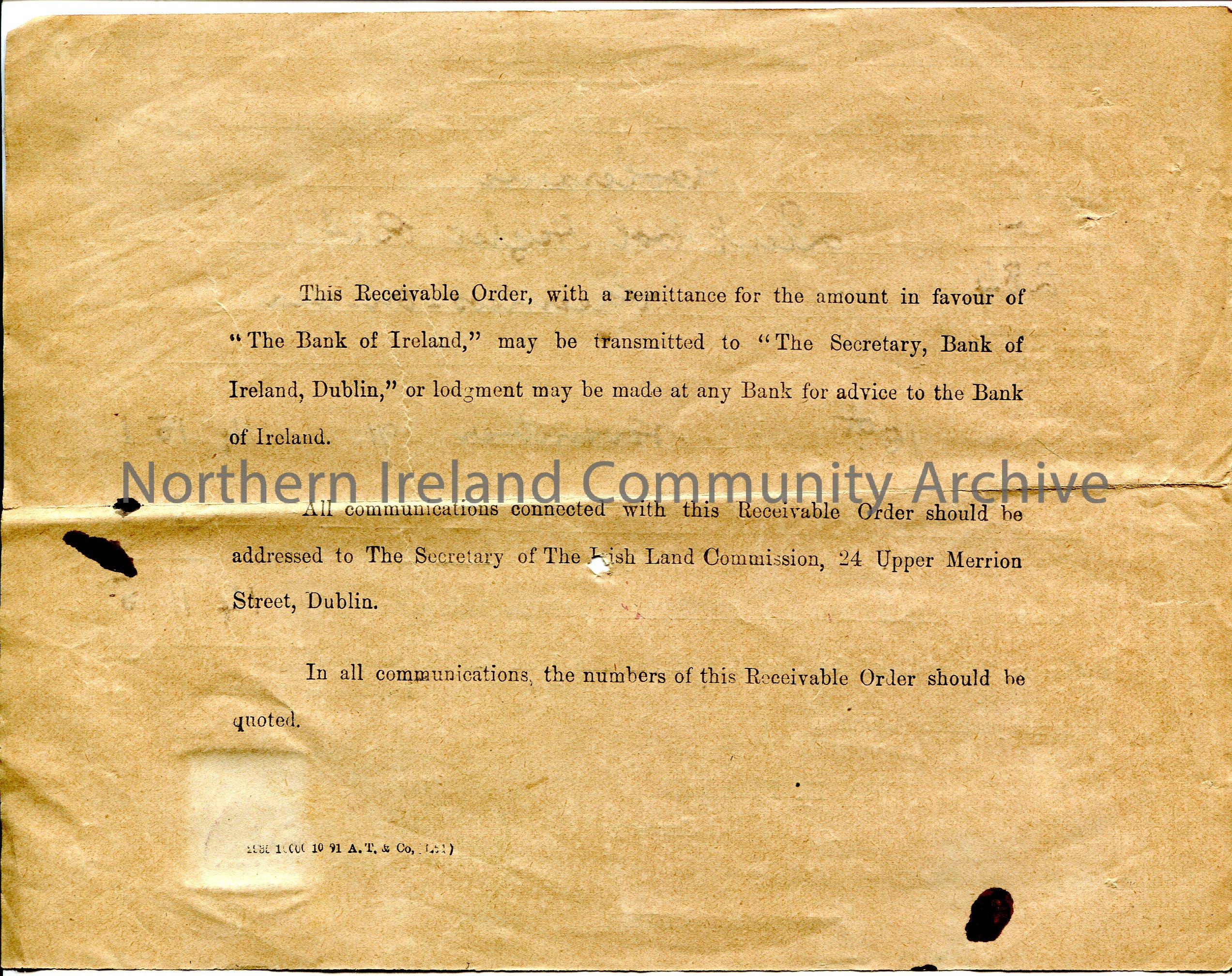 Handwritten Receivable Order, No. 7 284, for payment of £14.11.5 due 15th November 1891 to credit the Cash Account of The Irish Land Commission (… – scan103b