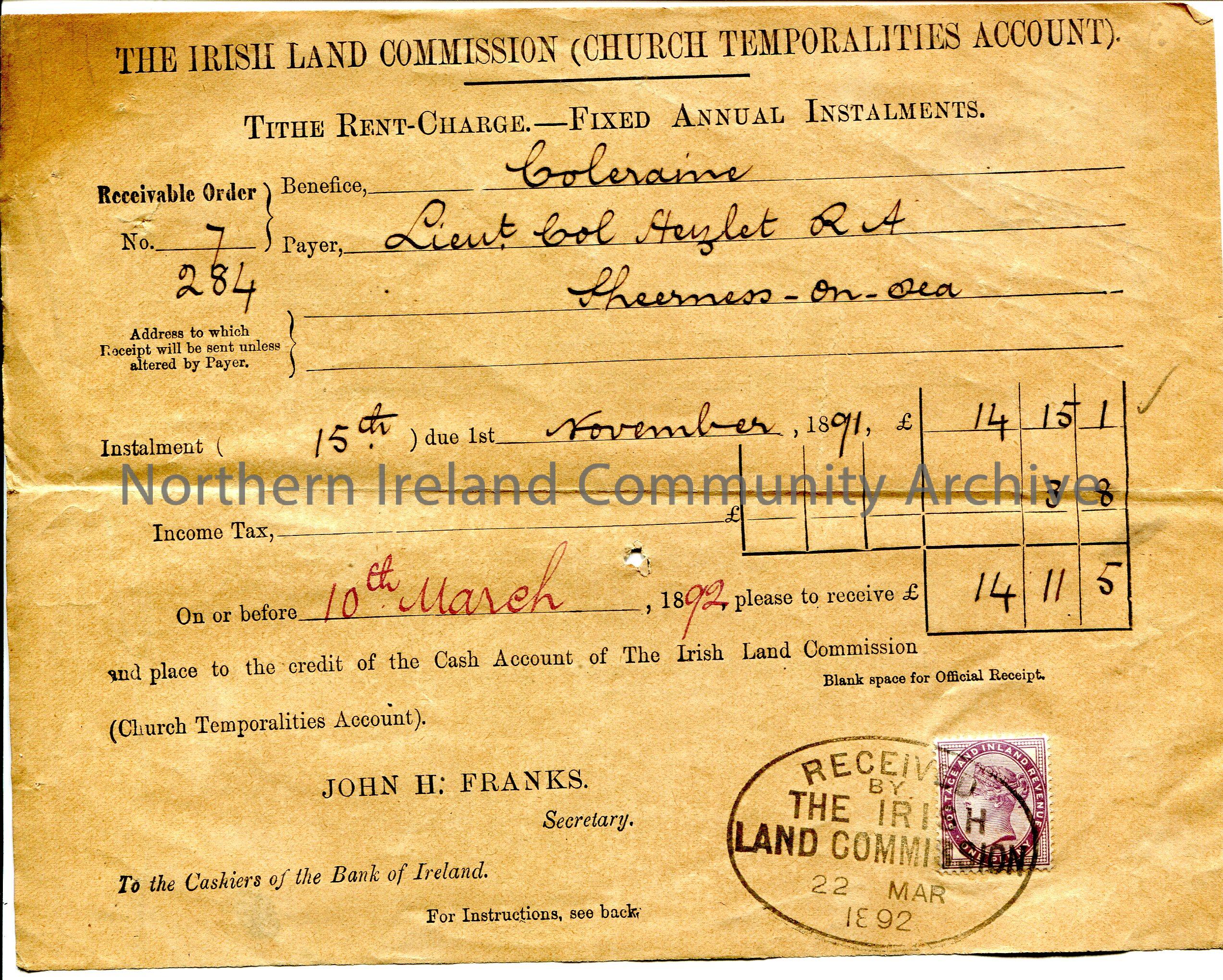 Handwritten Receivable Order, No. 7 284, for payment of £14.11.5 due 15th November 1891 to credit the Cash Account of The Irish Land Commission (Church Temporalities Account), John H. Franks as Secretary. Benefice - Coleraine. Payer - Lieut Col Hezlet R. A, Sheerness-on-sea. Received stamp dated at 22 March 1892 over penny lilac postage stamp of Queen Victoria.