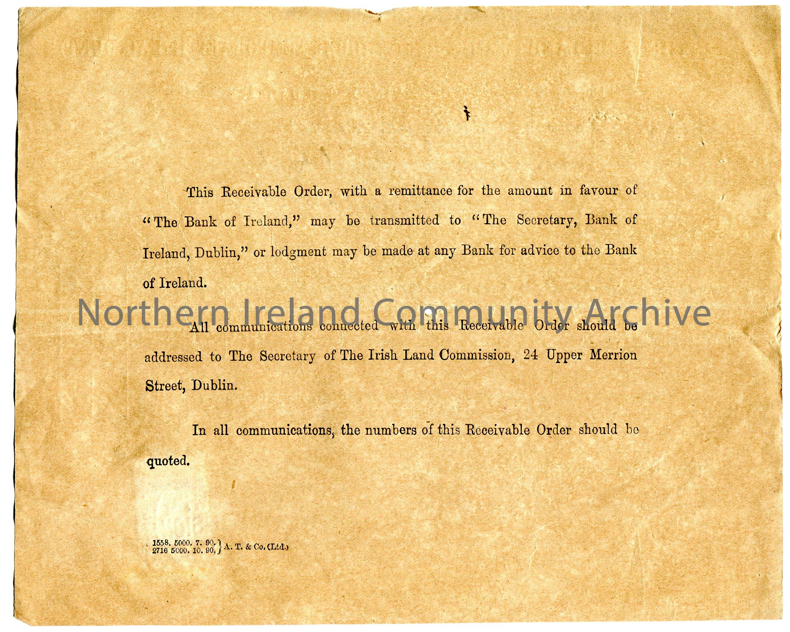 Handwritten Receivable Order, No. 7 286, for payment of £5.10.11 due 15th November 1890 to credit the Cash Account of The Irish Land Commission (… – scan100b