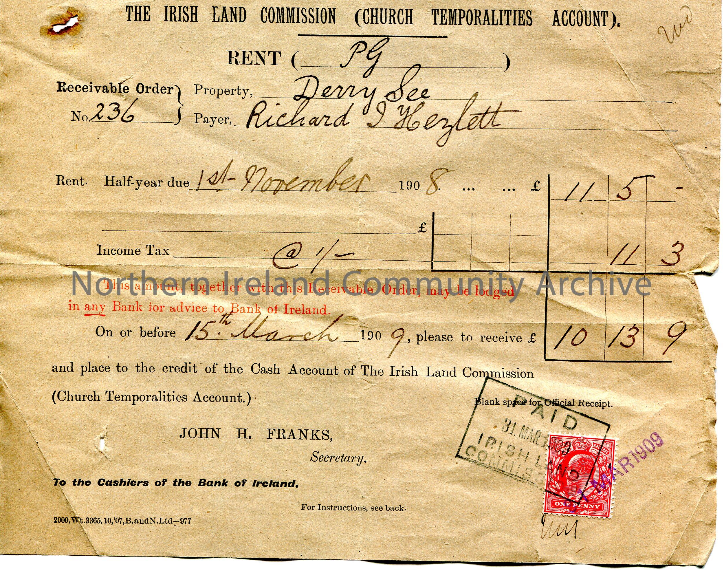 Handwritten Receivable Order to The Irish Land Commission (Church Temporaries Account. Payer Richard J Hezlet [Hezlet]. Rent for half year due on 1st November, 1908 for £10.13.9. To be paid before 15th March 1909. Stamp stating money was paid on 31st March 1909. Red one penny Edward VII stamp in bottom right corner. Postal address given as Robt [Robert] Given, Es, The Castle, Buncrana, Co. Donegal.