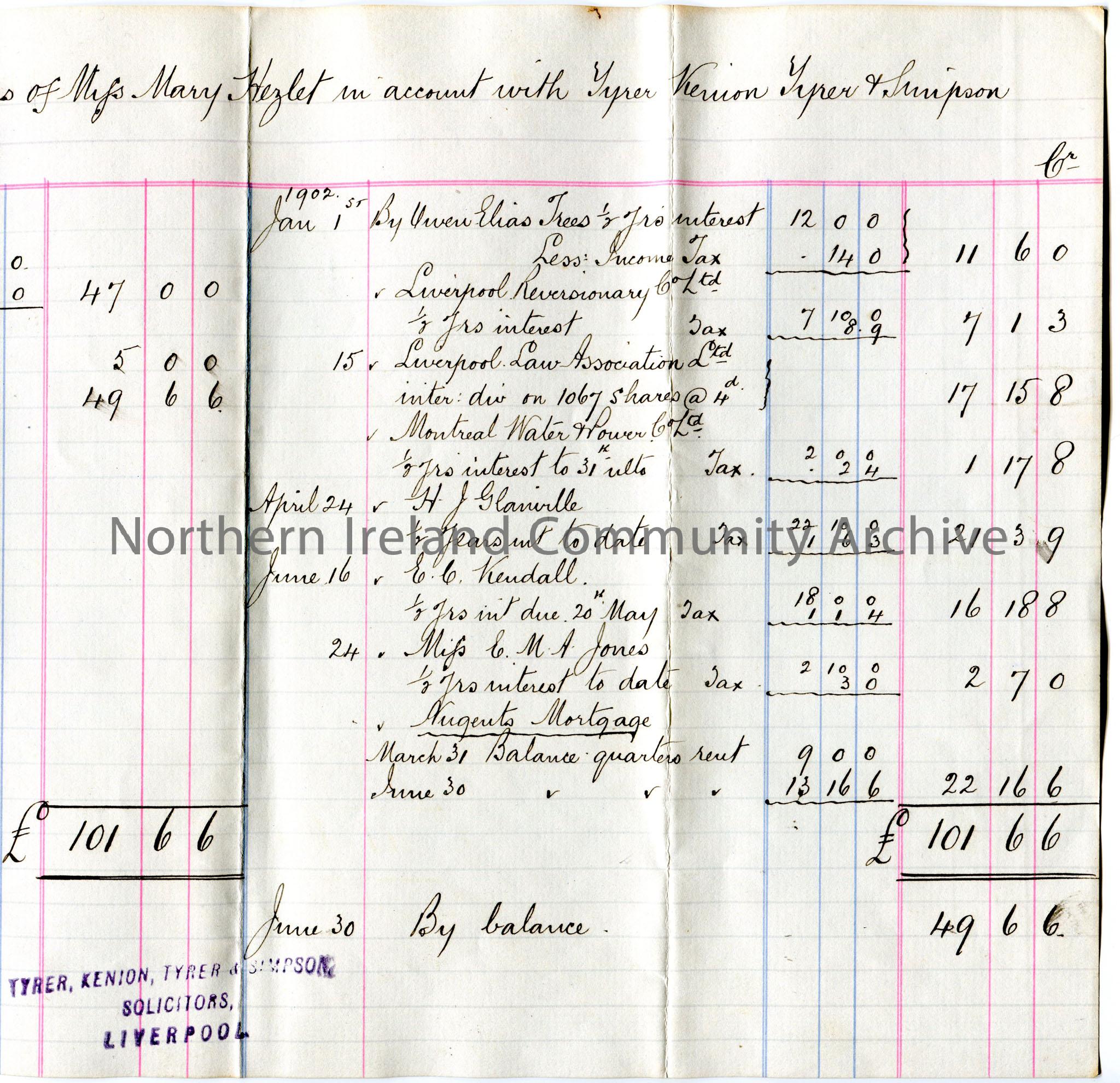 Handwritten record of accounts for 'Miss Elizabeth Hezlet and the Executors of Miss Mary Hezlet', from Tyrer, Kenion, Tyrer & Simpson Solicitors. Half yearly statement, January to June, 1902.