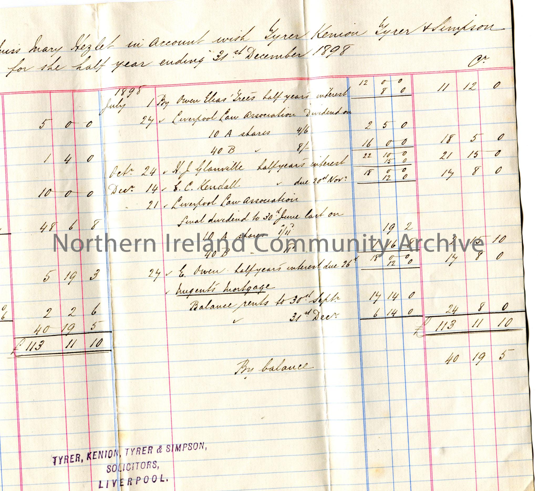 Handwritten record of income accounts for 'Miss Elizabeth Hezlet and the Executors of Miss Mary Hezlet', from Tyrer, Kenion, Tyrer & Simpson Solicitors. Half yearly statement, July to December, 1898.