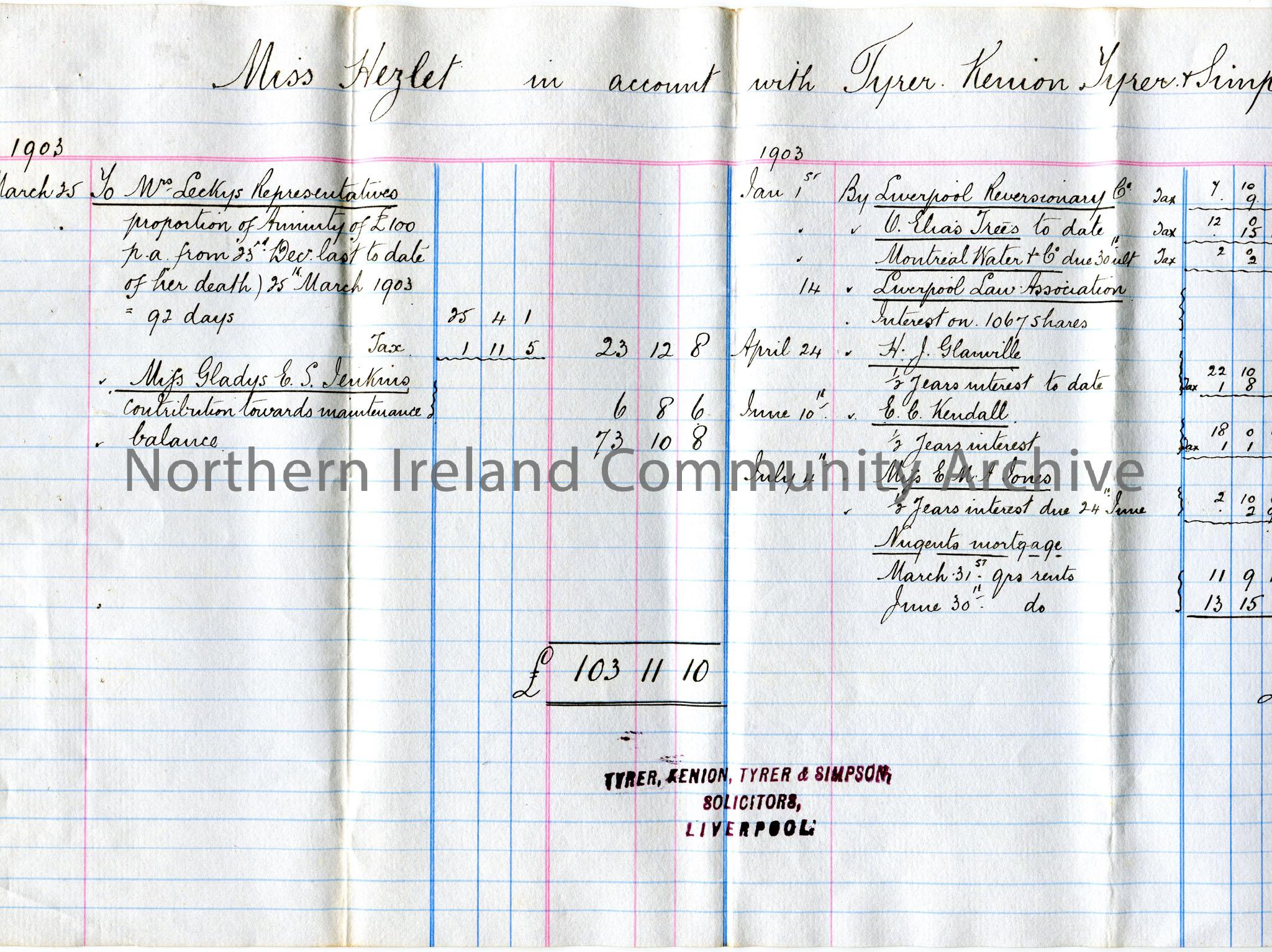 Handwritten record of income accounts for ‘Miss Hezlet’, from Tyrer, Kenion, Tyrer & Simpson Solicitors. Statement for January to July, 1903.