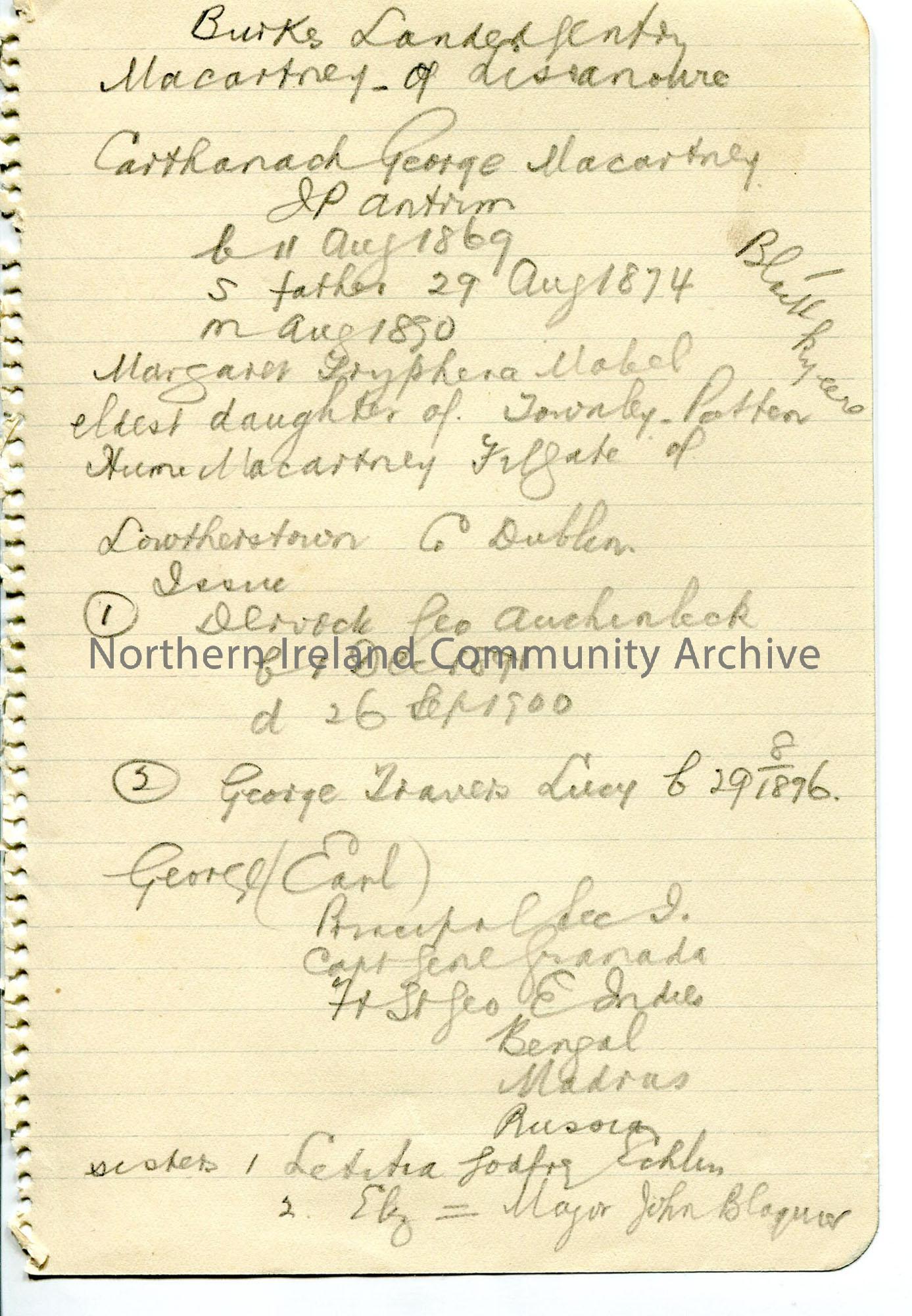Handwritten rough notes - detail of 19th century McCartney family line. Note under 'issue - 1' - 'Auchinleck' (village in Ayrshire) as one of first names