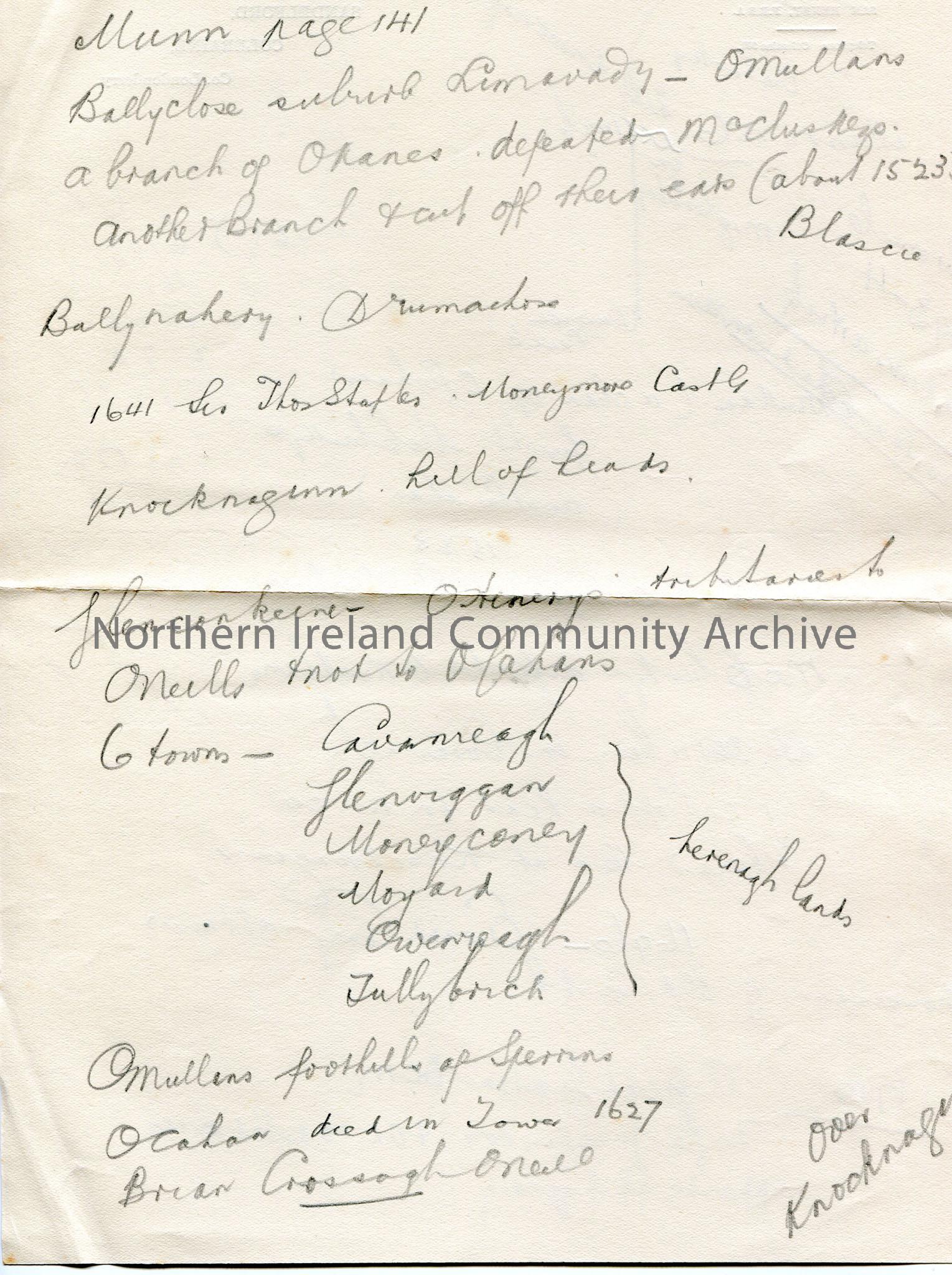 Handwritten rough notes, double sided, in pencil on headed paper - Sam Henry, Sandelford, Coleraine. Notes re O'Cahans, McCluskys. Mentions Edward Carey 1696; Brian Crossagh O'Neill; Foyle frozen over...roasted on ice opposite Shipquay, 1740. Mentions Ballyclose suburb Limavady; Ballynahery, Drumachose; Moneymore Castle. Mentions towns- Cavanreagh, Glenriggan, Moneyconey, Moyard, Owenreagh, Tullybrick which are noted as herenagh lands.