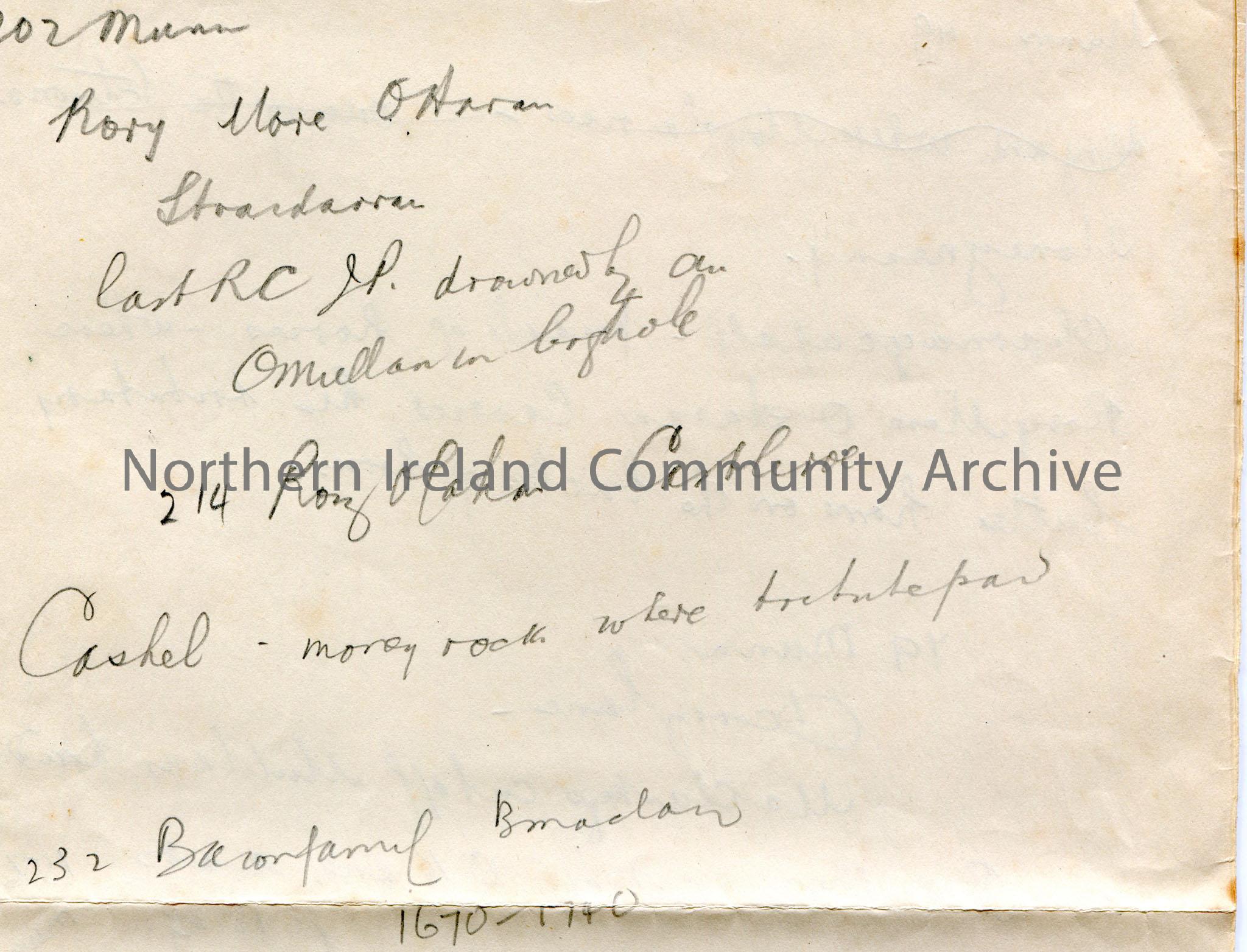 Handwritten rough notes, double sided, re Shane Crossagh. Mentions names Rory More O’Aaran; McCluskey, O’Mullan, O’Kane. Mentions places Castleroe, Ca… – scan049c