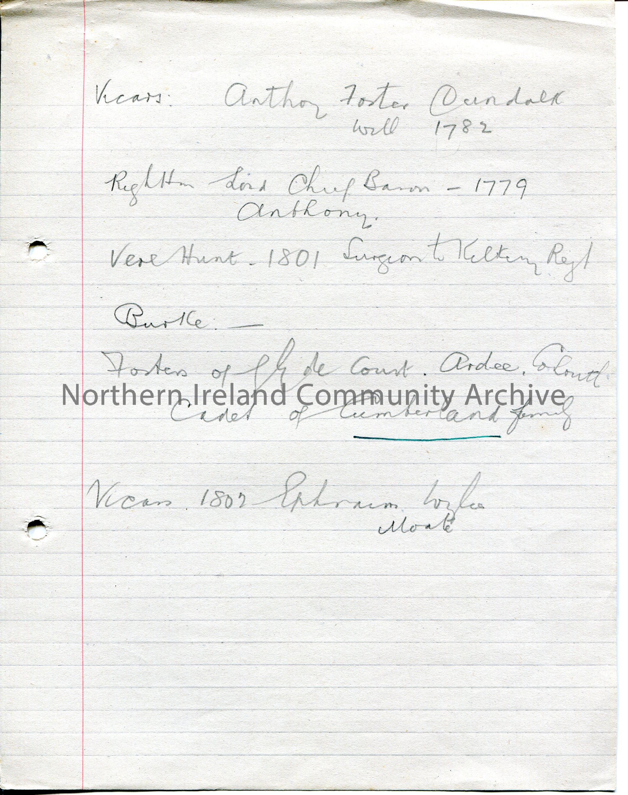 Handwritten rough notes in pencil on lined paper. Re Vicars. Mentions the name Anthony Foster of Dundalk.