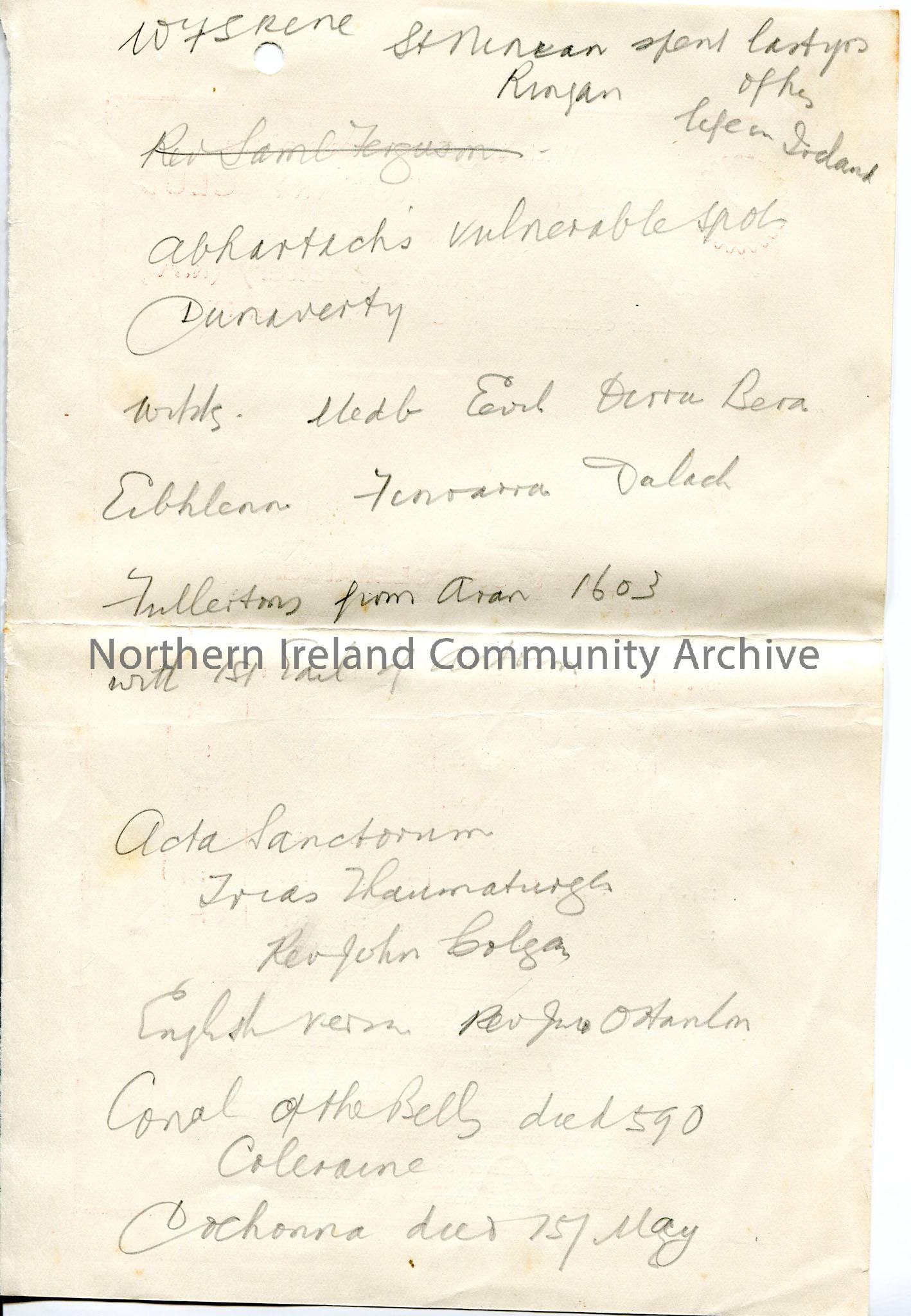 Handwritten rough notes – mentions Fullertons from Aran 1603 with 1st Earl of Antrim [not created Earl until 1620s]