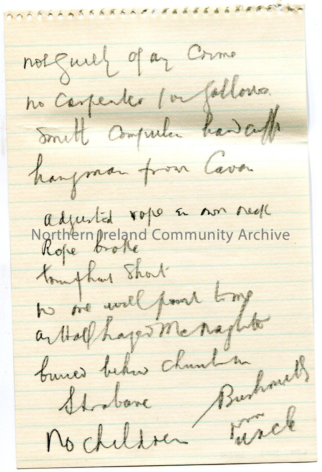 Handwritten rough notes on a small, lined page. Describes the botched hanging of McNaghten.