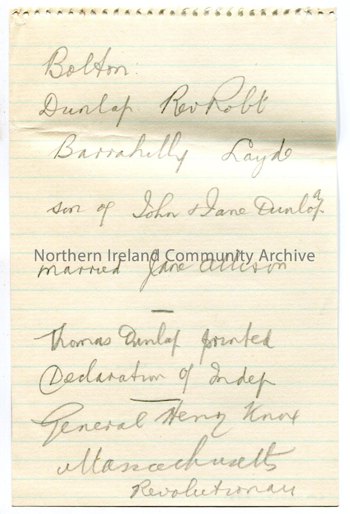Handwritten rough notes on a small, lined page. Genealogical information re the name Dunlap. Also mentions the name Knox.