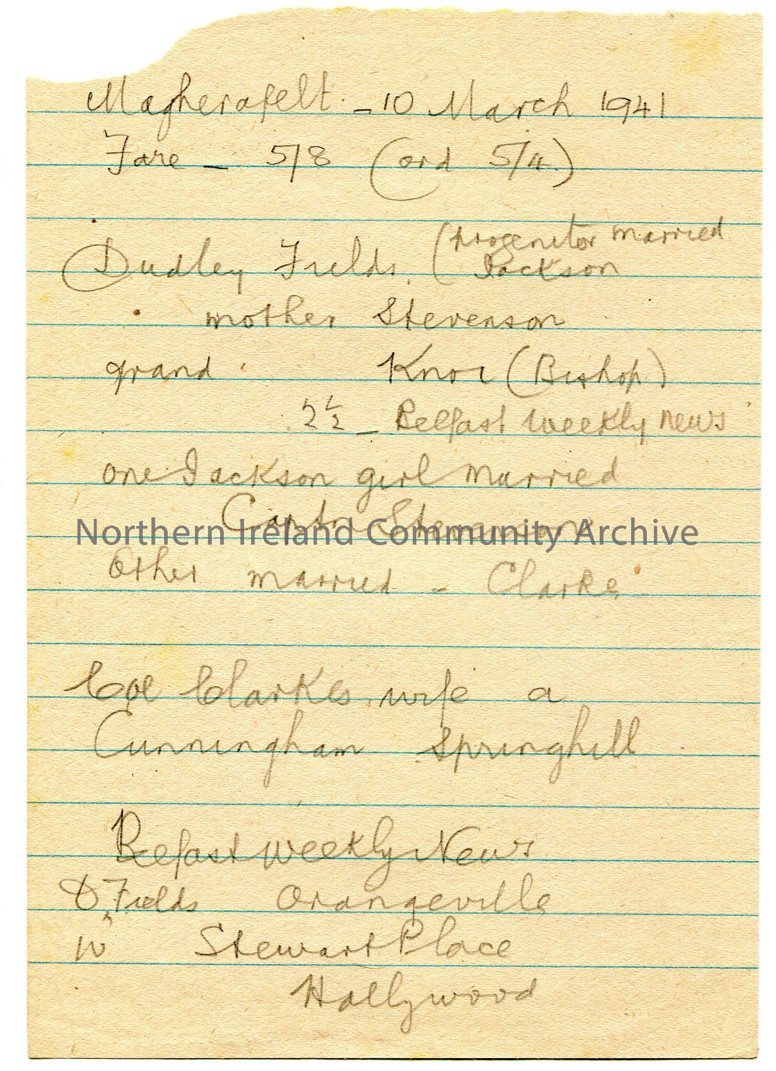 Handwritten rough notes on lined paper. Mentions Magherafelt 10th March 1941, fare 5/8. Also mentions genealogical information. Mentions surnames Fields, Captain Stevenson, Jackson, Col Clarke, Cunningham Springhill.