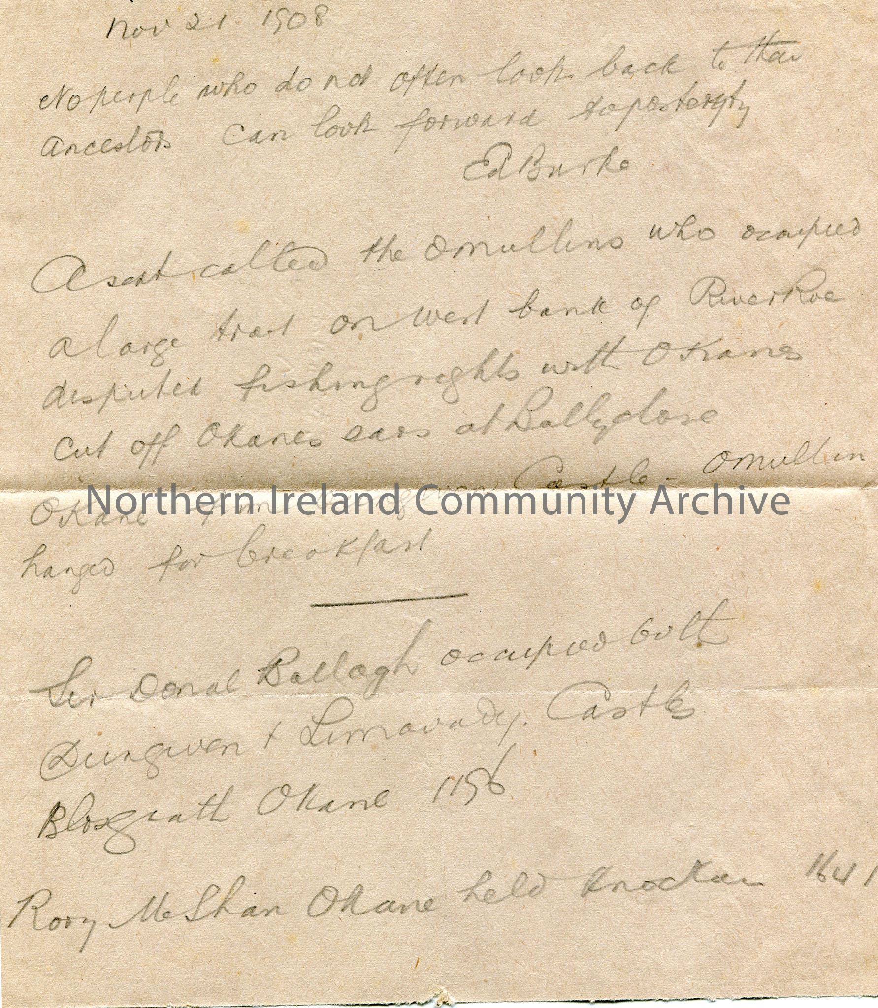 Handwritten rough notes. Quote by Ed Burke dated 21st November, 1908 re ancestry. Other notes mention O'Mullins and O'Kanes and dispute over fishing rights on River Roe. Also mentions Sir Donal Ballagh, Dungiven and Limavady castles; Rory McShan O'Kane.
