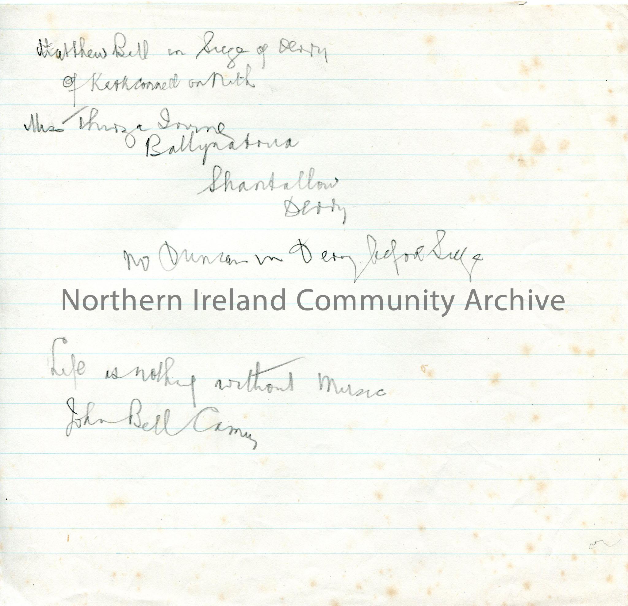 Handwritten rough notes re Bells and Thirza Irvine’s address in Shantallow