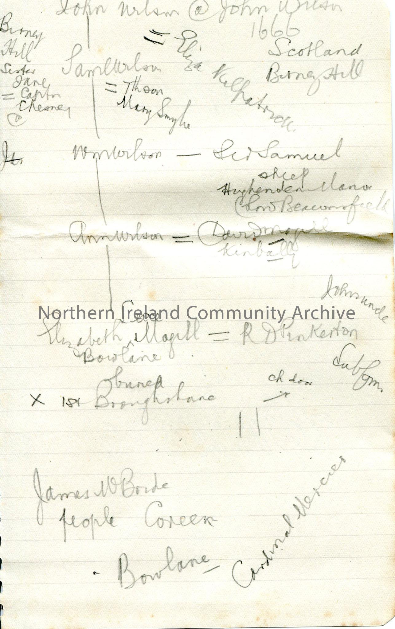 Handwritten rough notes re family line of Wilsons including surname of Bowlane - mentions Scotland, Broughshane