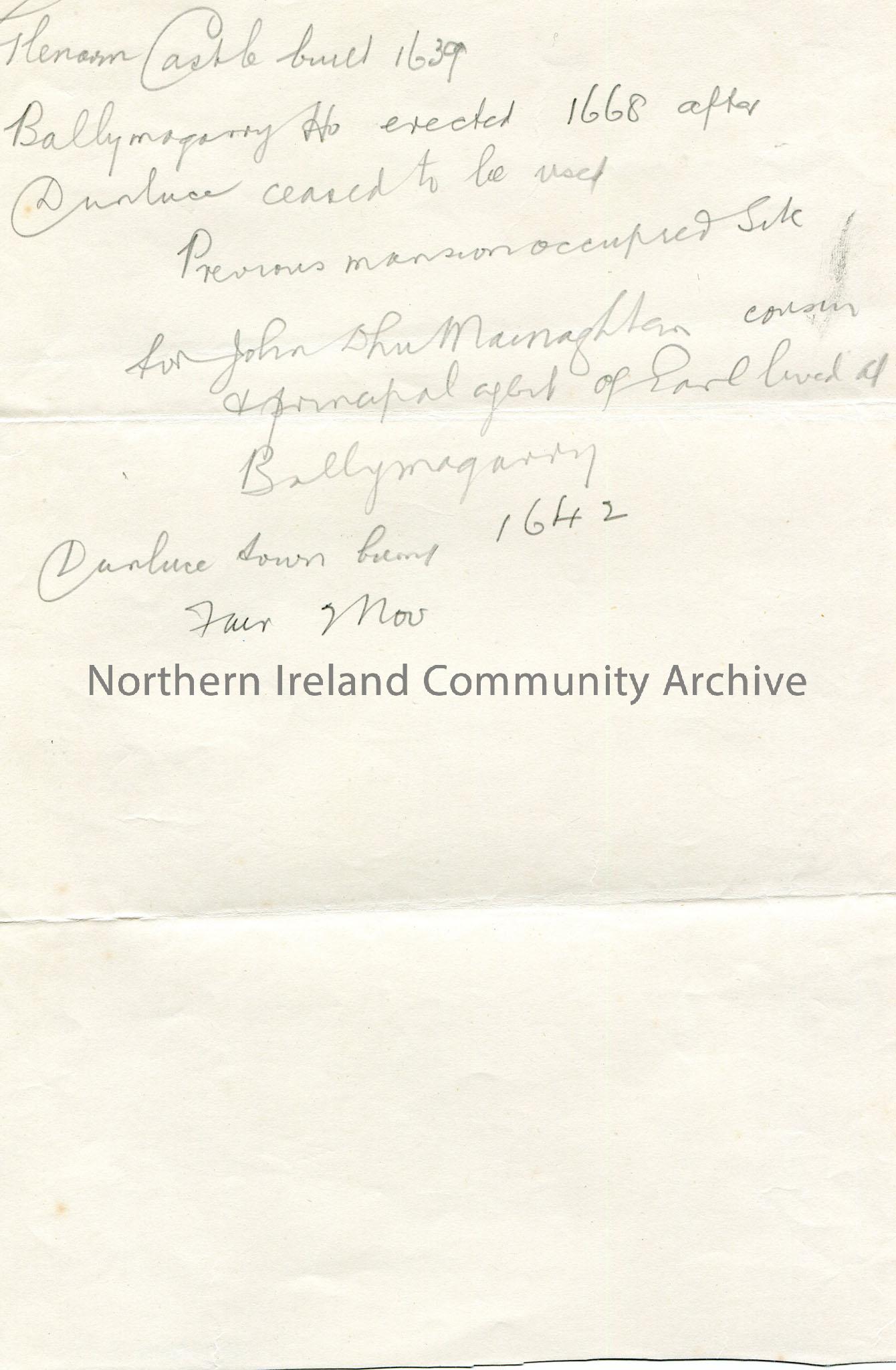 Handwritten rough notes re Glenarm Castle and Ballymagarry.