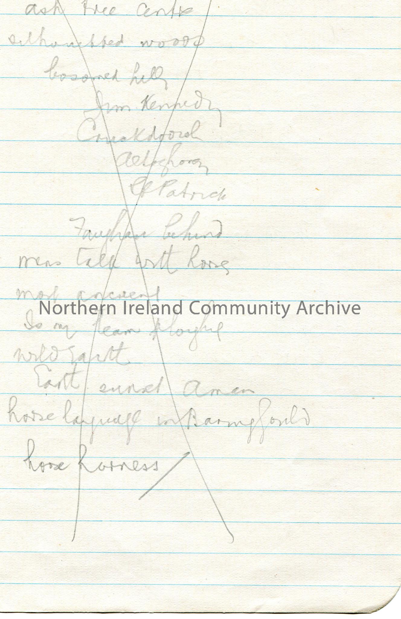 Handwritten rough notes re the hanging of Shane Crossagh in Derry. Rough notes, not in context, on back of page with an X through them. – scan013b