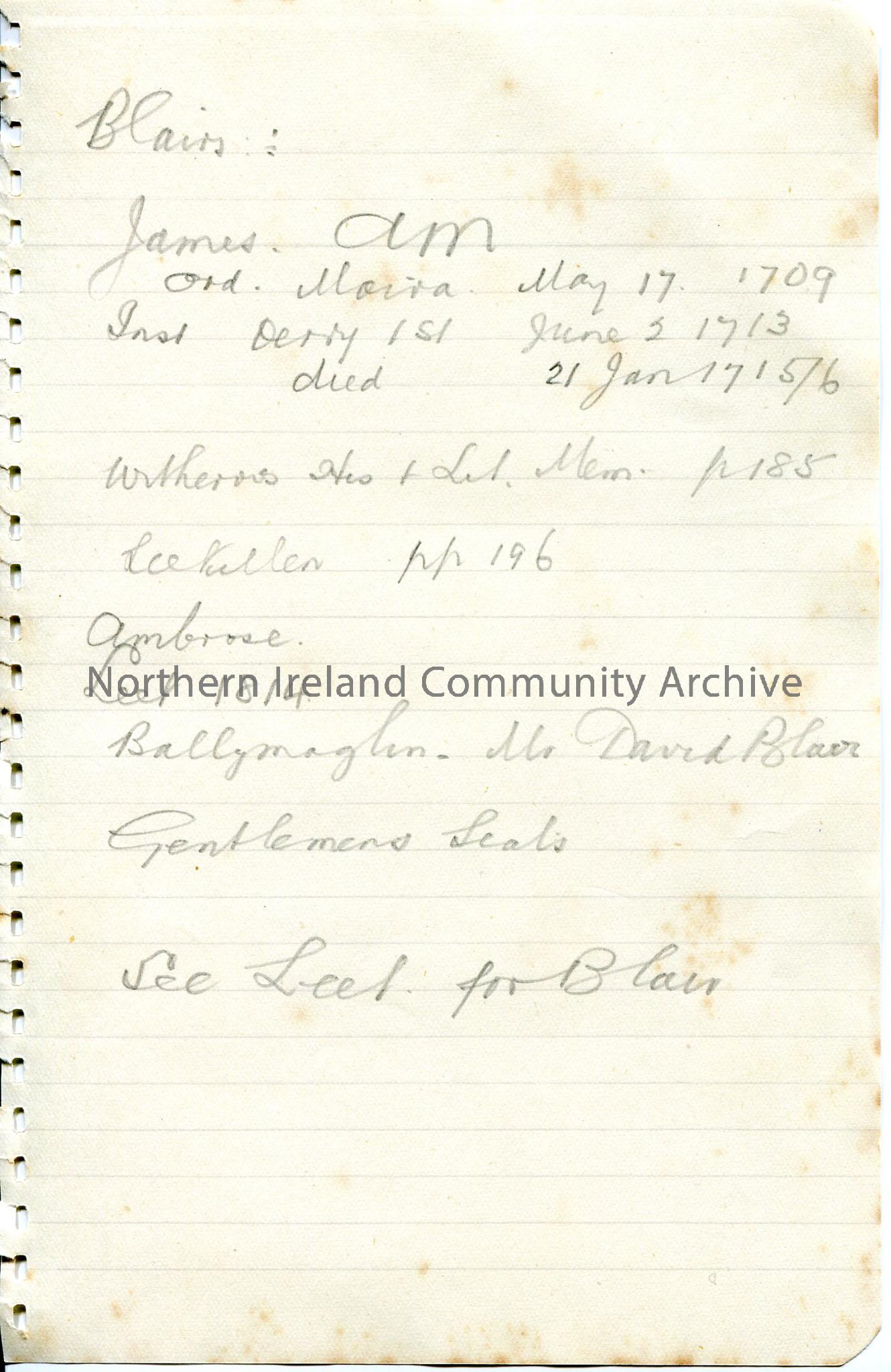 Handwritten rough notes under heading ‘Blairs’ – 18th century names and dates
