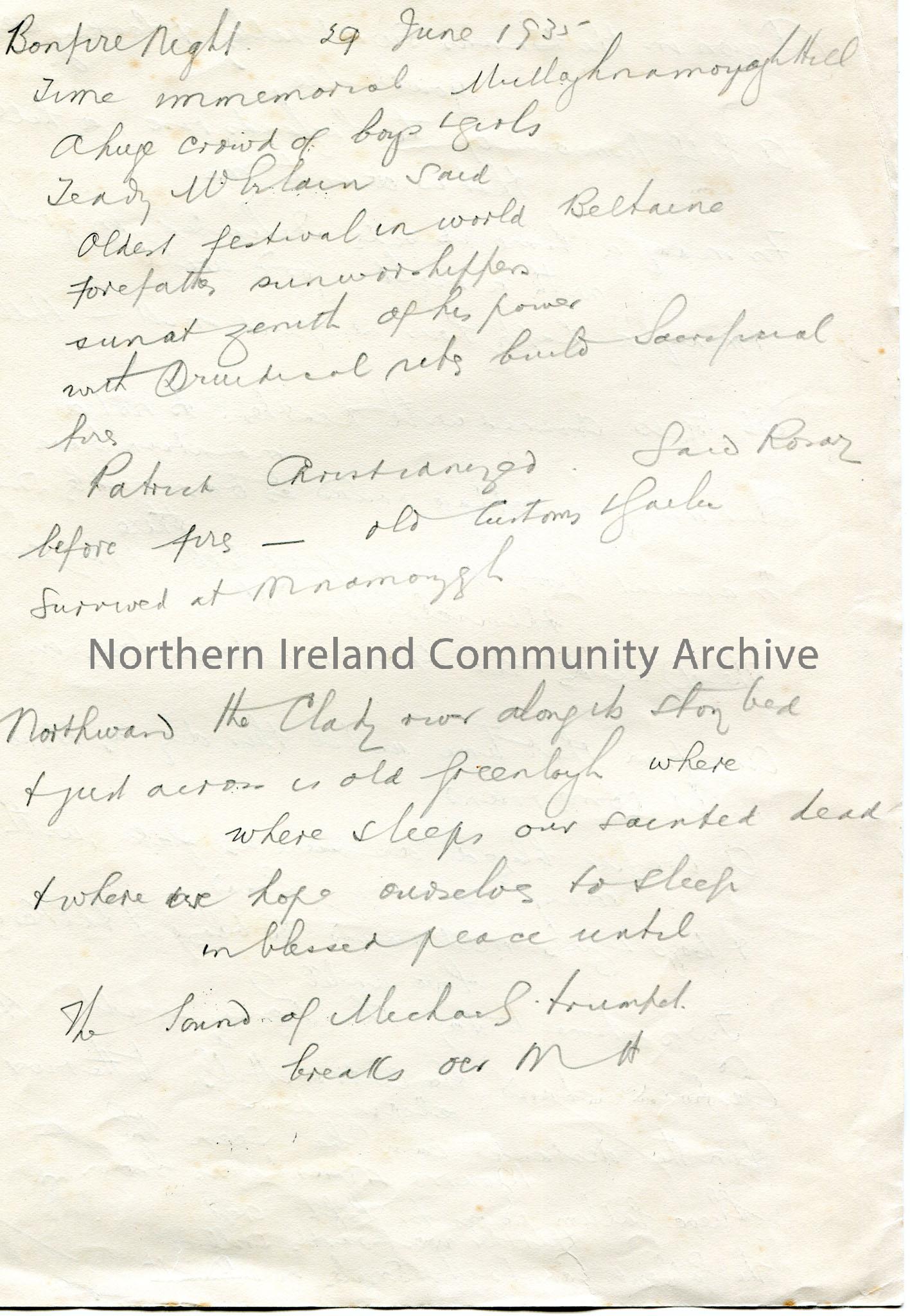 Handwritten song or poem in pencil on one side of page. Mentions Antrim hills and Mourne mountains. 'Songs of the people, The Oul Rigadoo' handwritten upside down bottom right corner. Notes on other side re Bonfire night, 29th June, 1935.