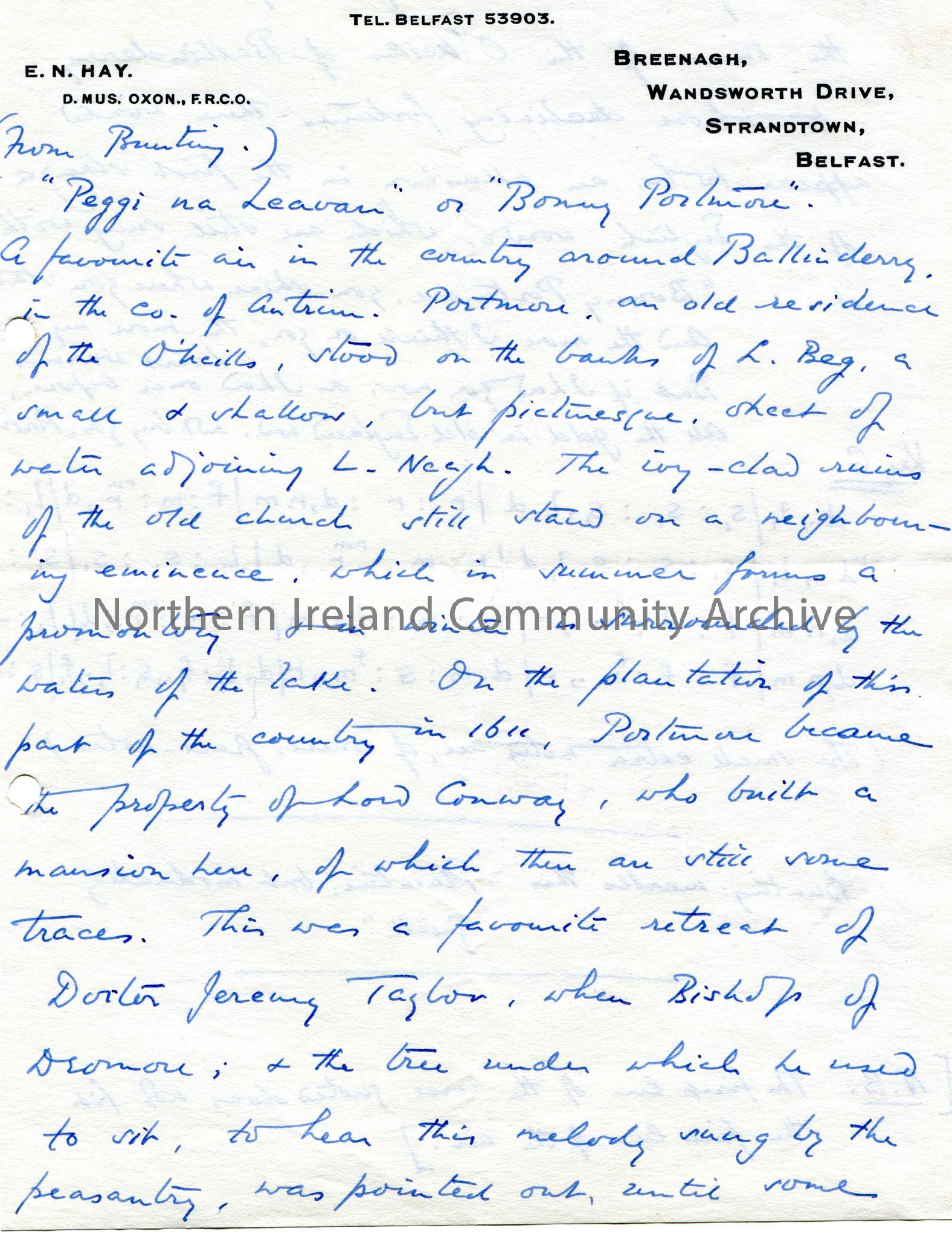 Handwritten song origin and tonic sol-fa notation ‘From Bunting’ re ‘Peggi na Leavan’ or ‘Bonny Portmore’. Written on headed paper used for letter wri…