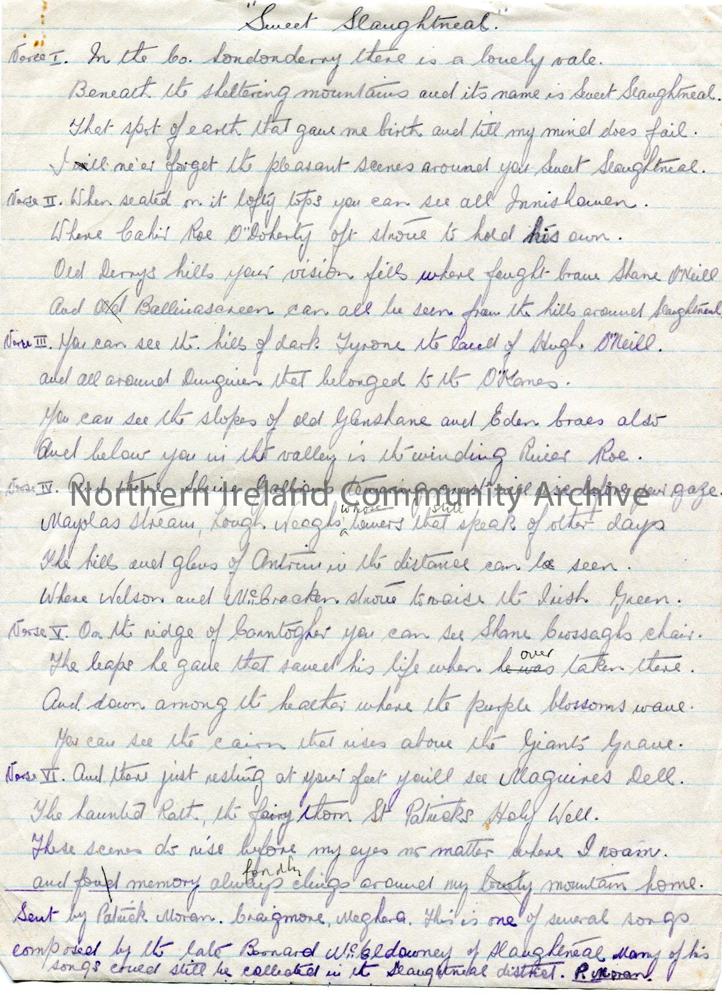 Handwritten song, six verses. Song titled “Sweet Slaughtneal”. Note states sent by Patrick Moran, Craigmore, Maghera. One of several songs composed by…