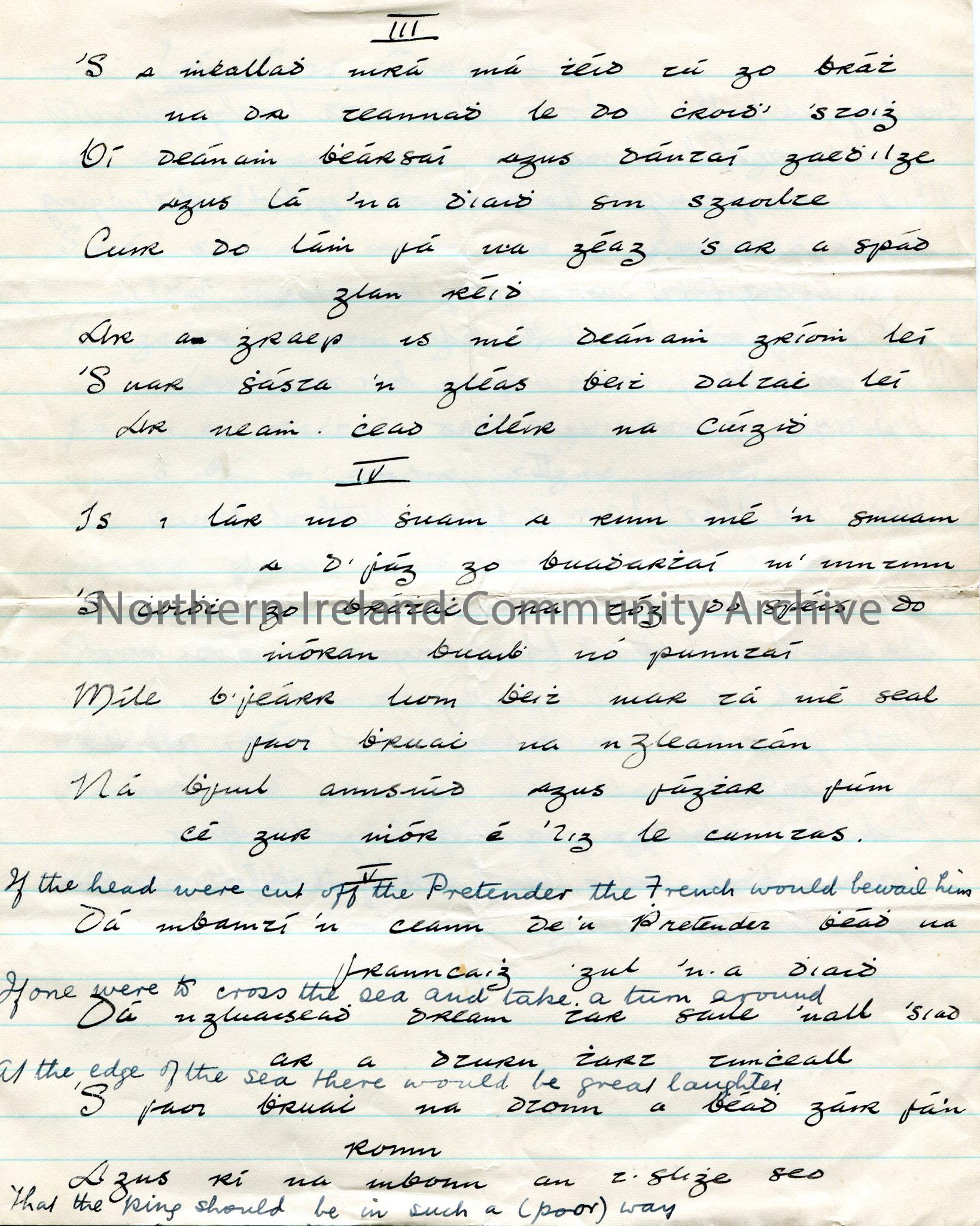 Handwritten song titled, “La Coss Cuasn”. One version of song is written in ink in Irish and the other version is written in English in pencil. Song i… – img331c