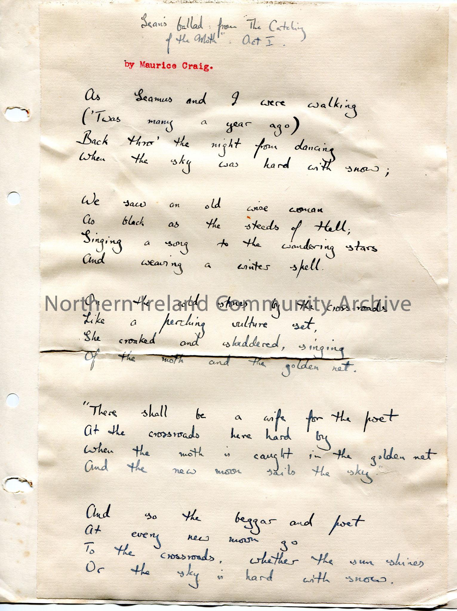 Handwritten song titled, ‘Sean’s ballad from ‘The Catching of the Moth’ Act 1′. Written on a page which has been stuck to a larger page.