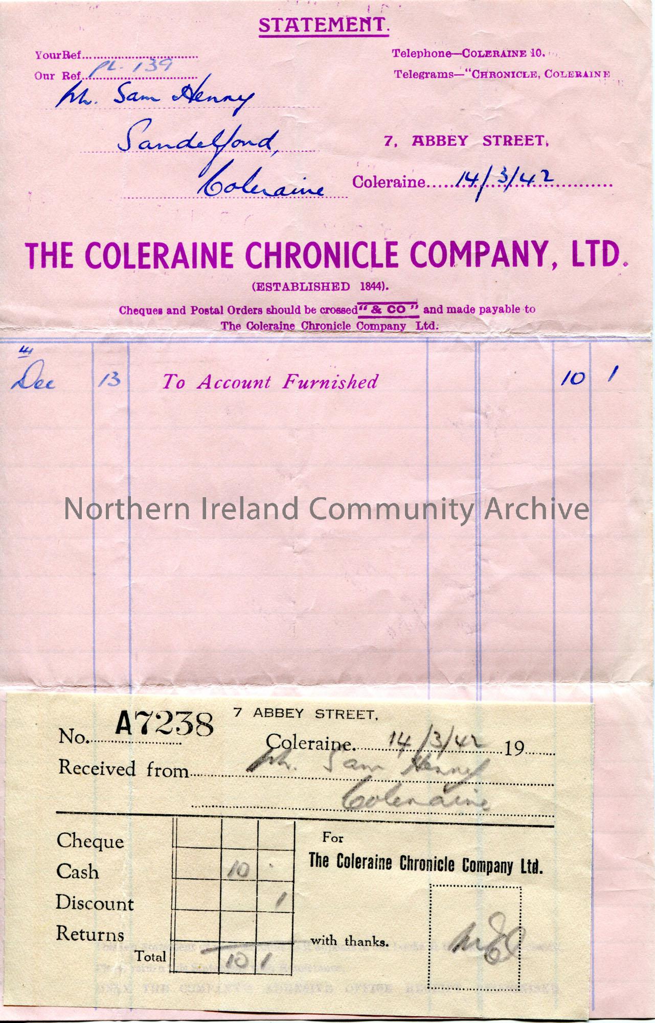 Handwritten statement (pink in colour) to Sam Henry from the Coleraine Chronicle. Dated 14th March 1942. Total of £0.10.1 paid by Sam.