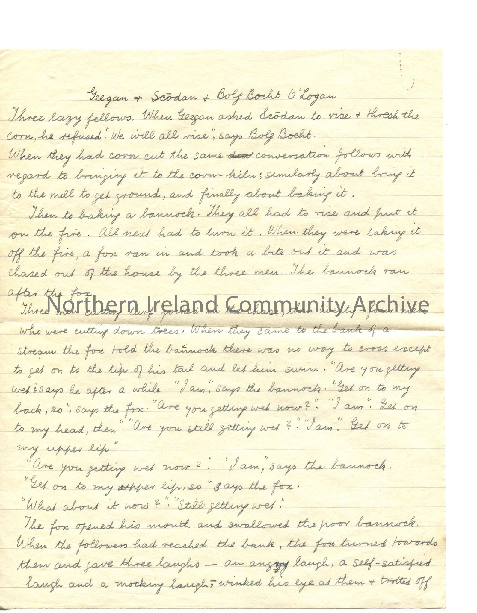 Handwritten story on lined paper titled, ‘Geegan & Scodan & Bolg Bocht O’Logan.’ Re three lazy men and a fox.