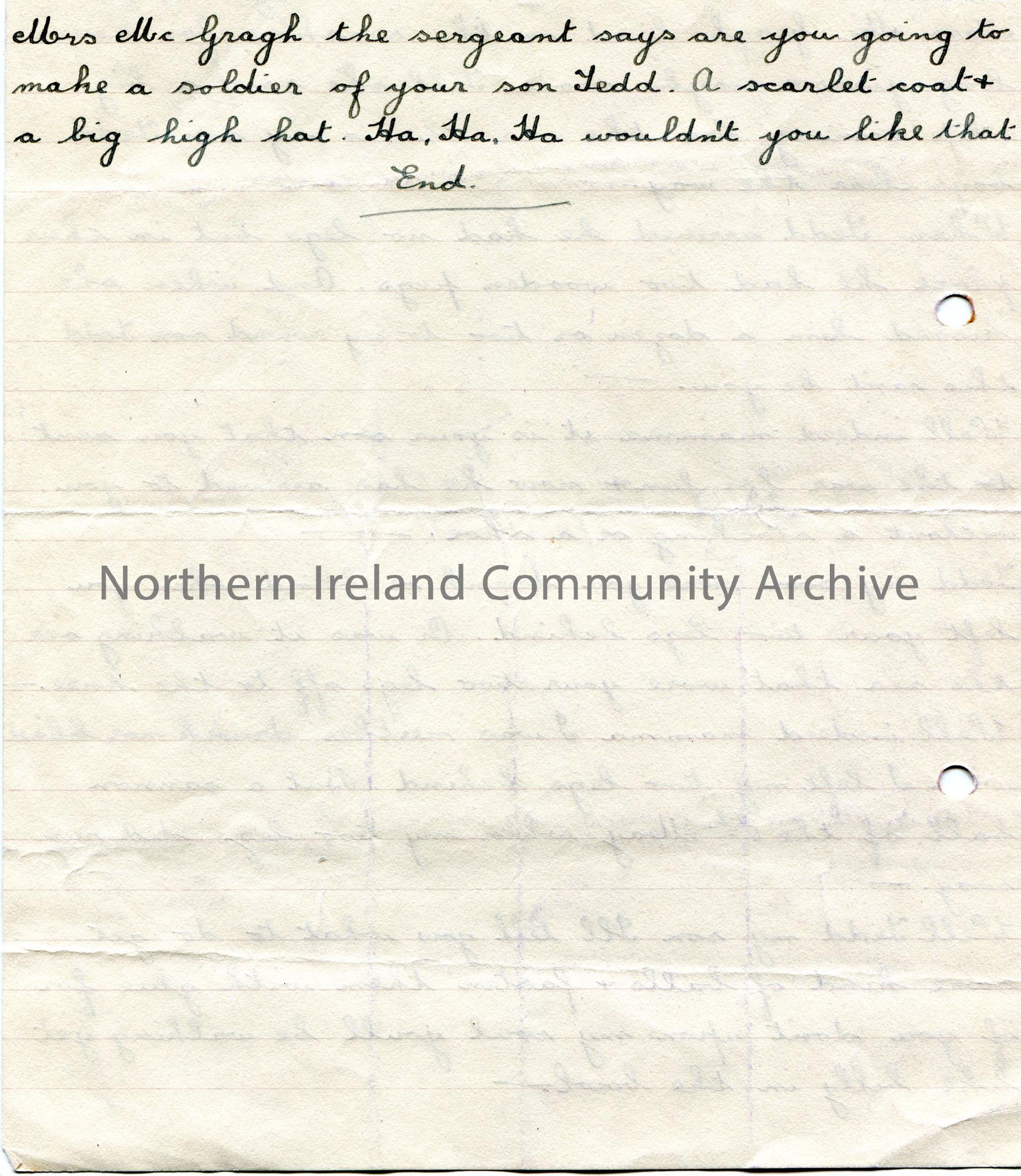 Handwritten story, one page double sided, titled, ‘My Son Ted’. Mrs McGragh’s son has come back from war injured. ‘Bob Watson, Chauffeur, Lizard Manor… – scan024b