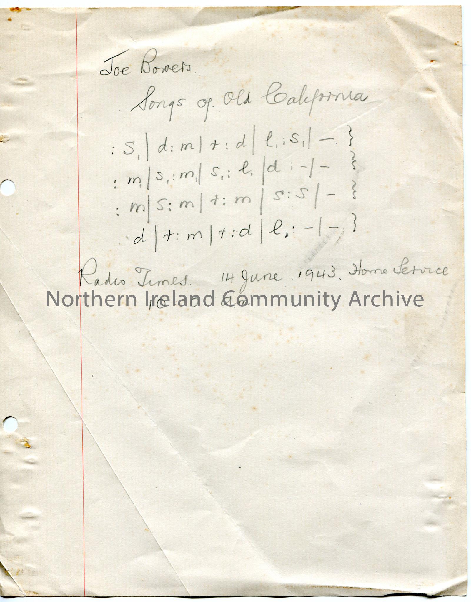 Handwritten tonic sol-fa notation titled, ‘Joe Bowers. Songs of Old California’. From the Radio Times. Dated 14th June, 1943. Home Service, 10am.