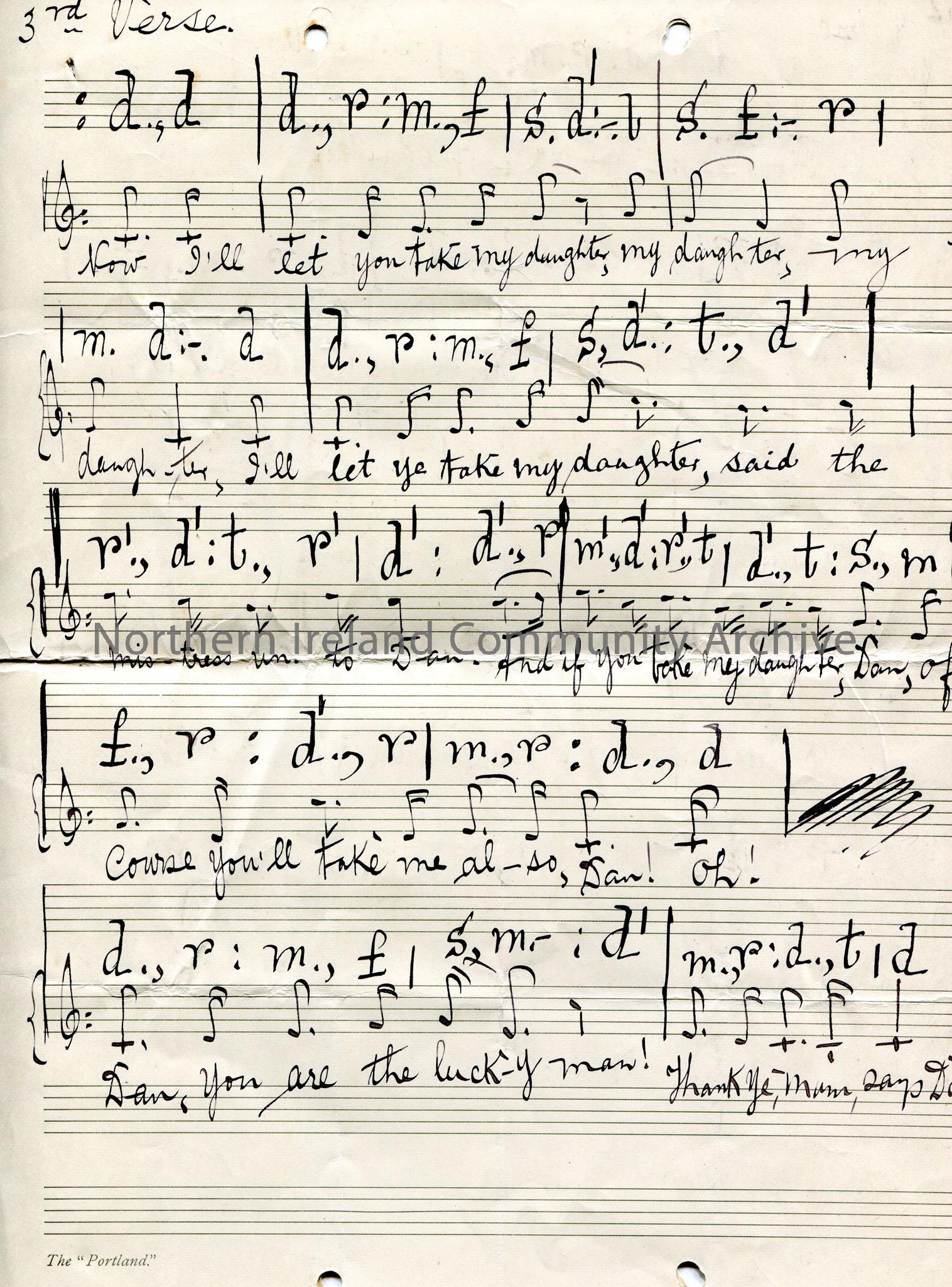 Handwritten tonic sol-fa notation titled, ‘Thank you Maam. Says Dan’. written over a booklet of two pages and four sides. Each side has one verse writ… – scan052c