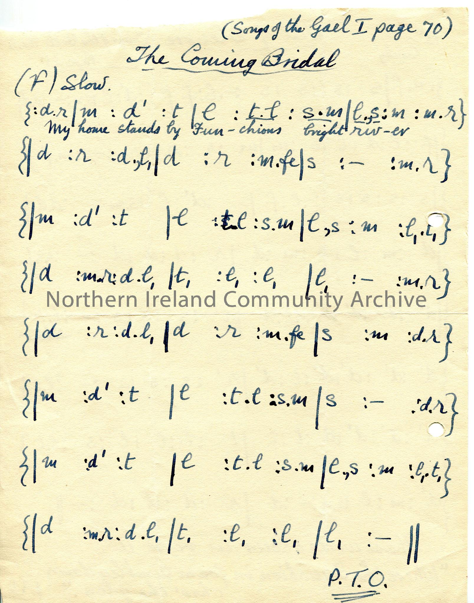 Handwritten tonic sol-fa notation to 2 songs - 1 on each side of page. 'The Coming Bridal', with first line of words; 'Will of Glenore', with words from verse 2