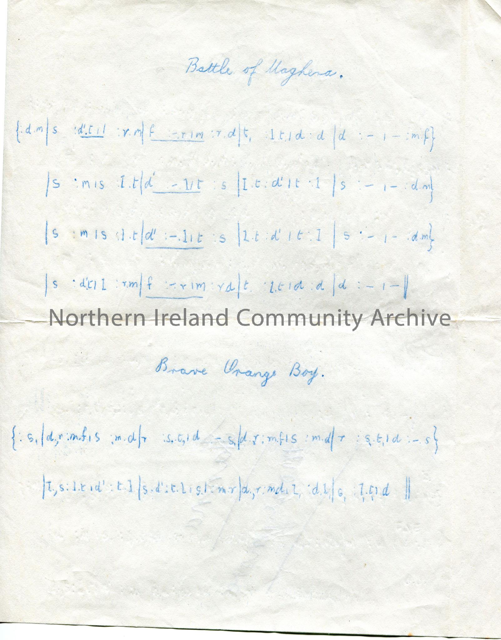 Handwritten tonic sol-fa notations titled, ‘Battle of Maghera’ and ‘Brave Orange Boy’. ‘Hanna Moneymore’ handwritten on back of page.