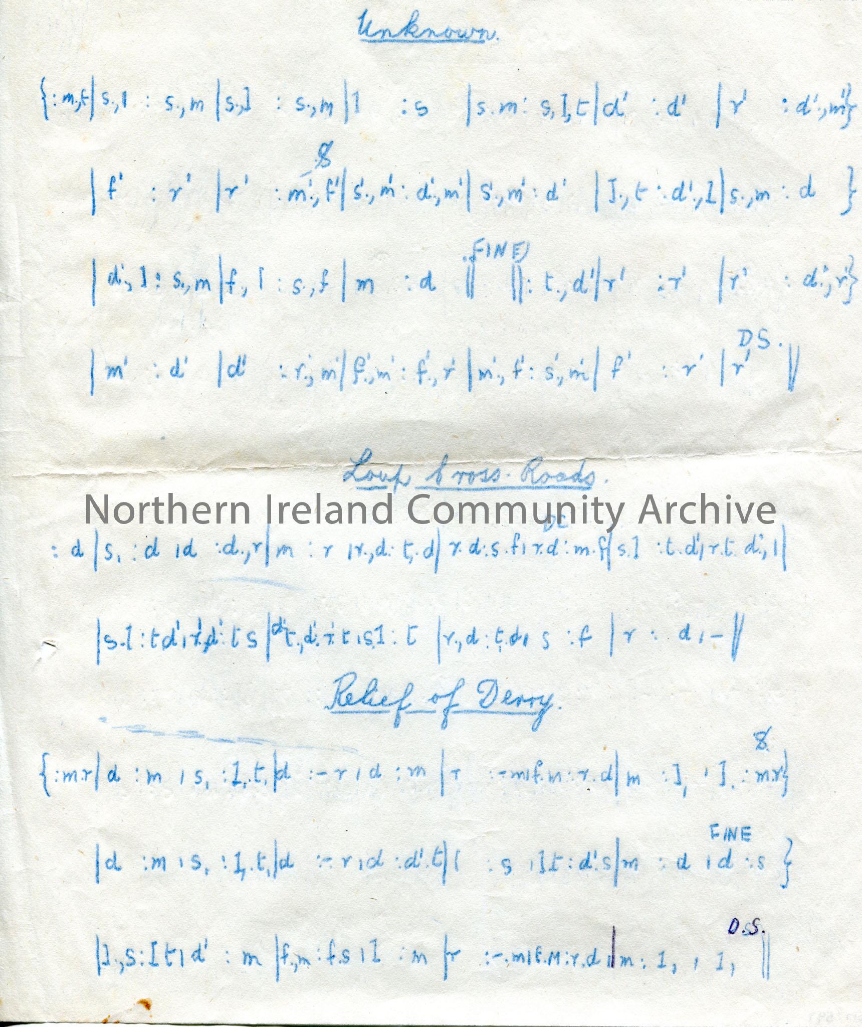Handwritten tonic sol-fa notations titled, ‘Unknown’, ‘Loup? Cross Roads’ and ‘Relief of Derry’.