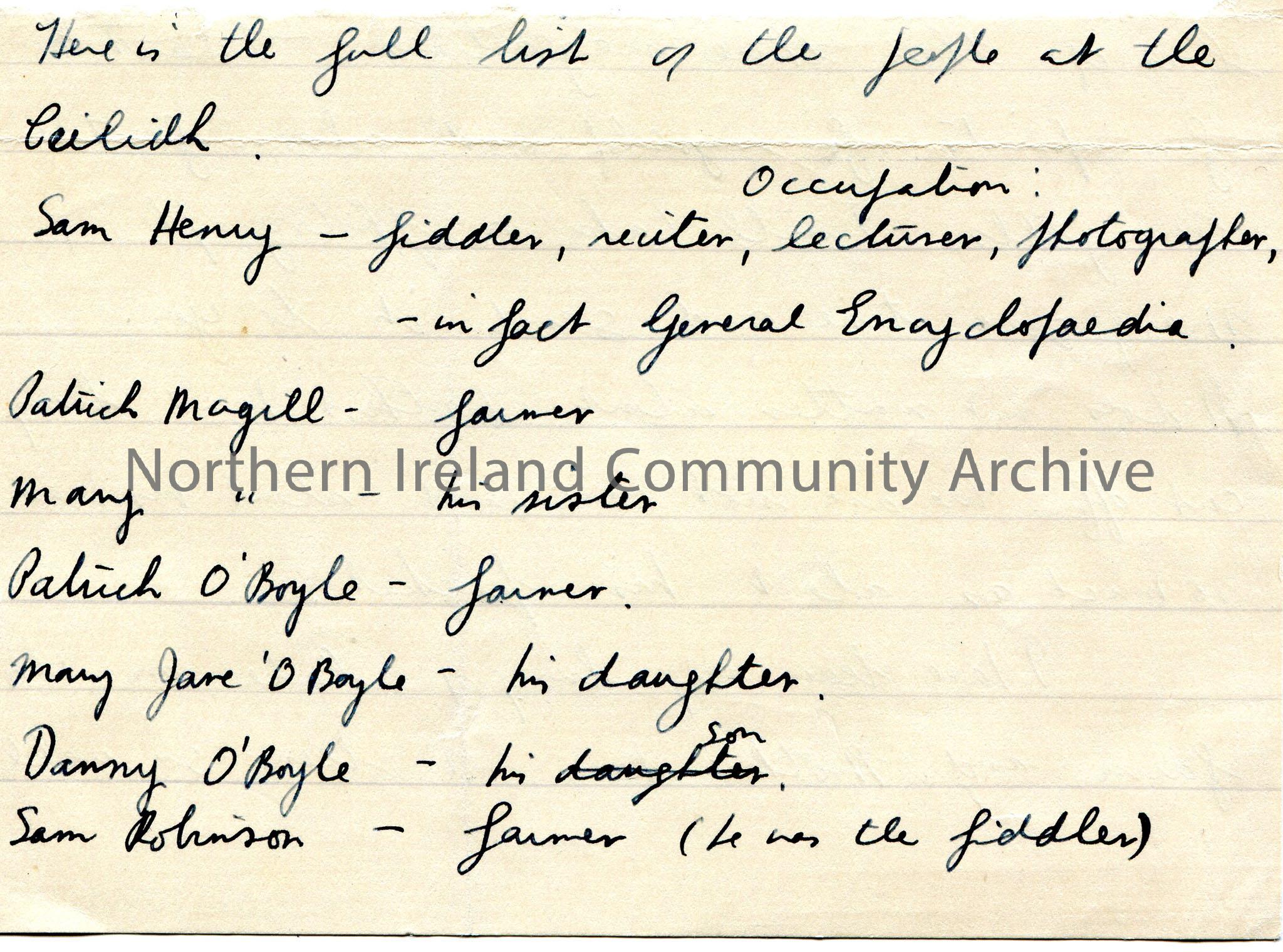 Handwritten torn page. Possibly part of a letter from Jimmie Knox. One side lists people who were at the Ceilidh. Describes Sam Henry's occupation. Refers to the Magill's, O'Boyles and Sam Robinson. On other side, the writer wants prints of negatives for themselves and the Magills, they will send a photograph of Mary, they have been busy and their mother is not well.