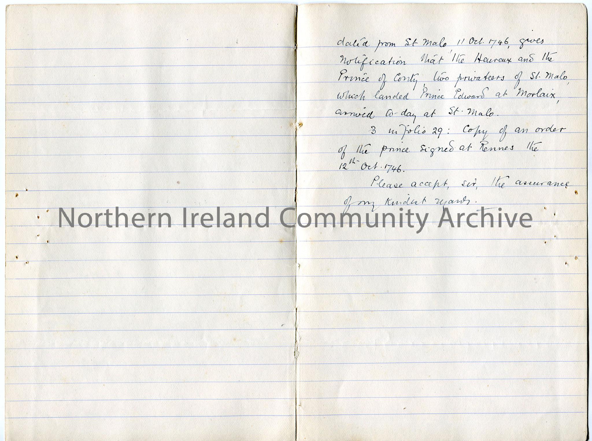 Handwritten transcript of translation of letter from Archives Nationales Marine in Paris - answer to Sam's request about the French privateer Bellone in 1746 - no records exist for this ship in that period but he gives extracts from 3 other documents which may help - dated 2nd, 11th and 12th October, they relate to the Prince having landed and being in France at that time.