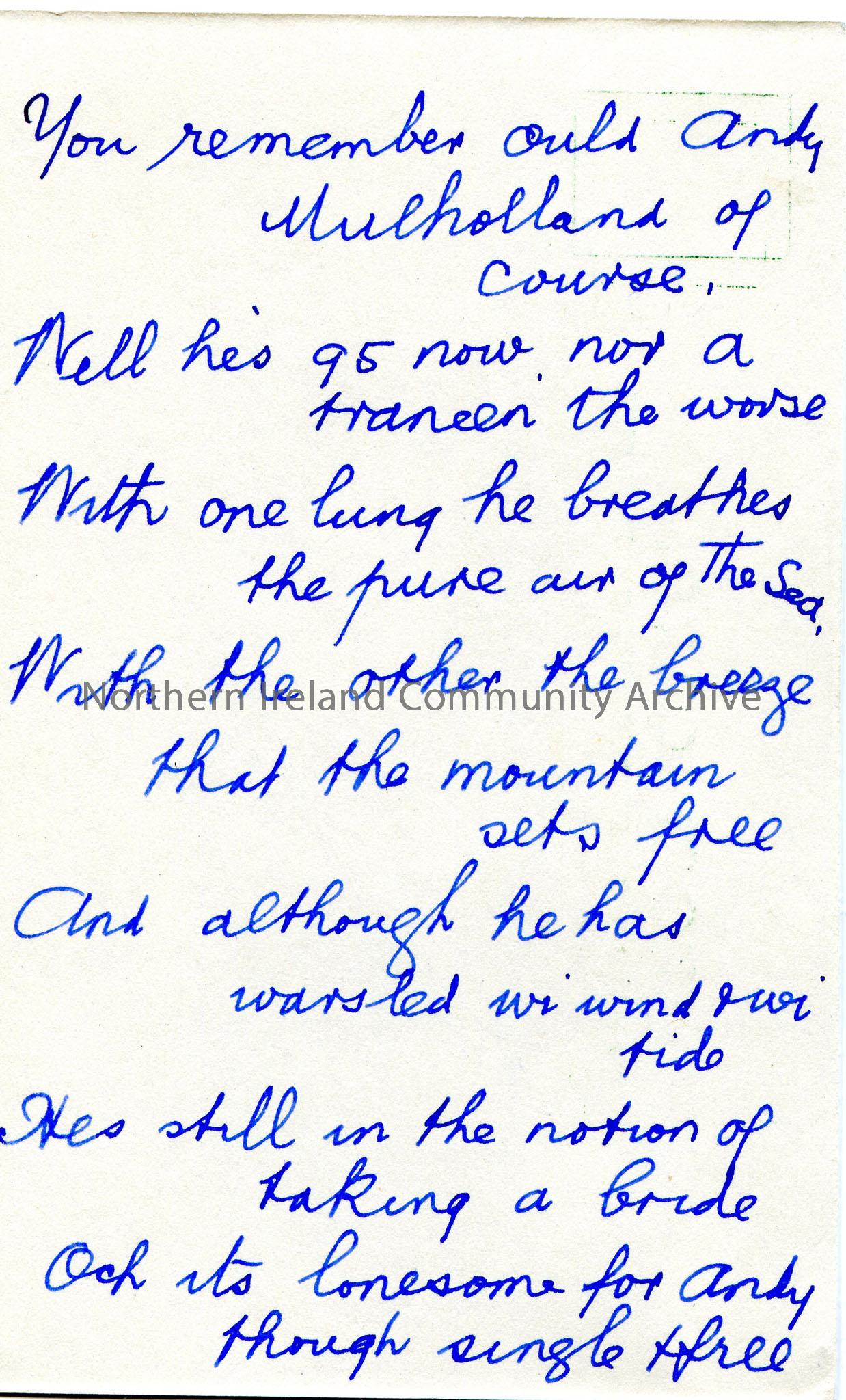 Handwritten verse of a song or poem on the back of a blank postcard re Andy Mulholland.