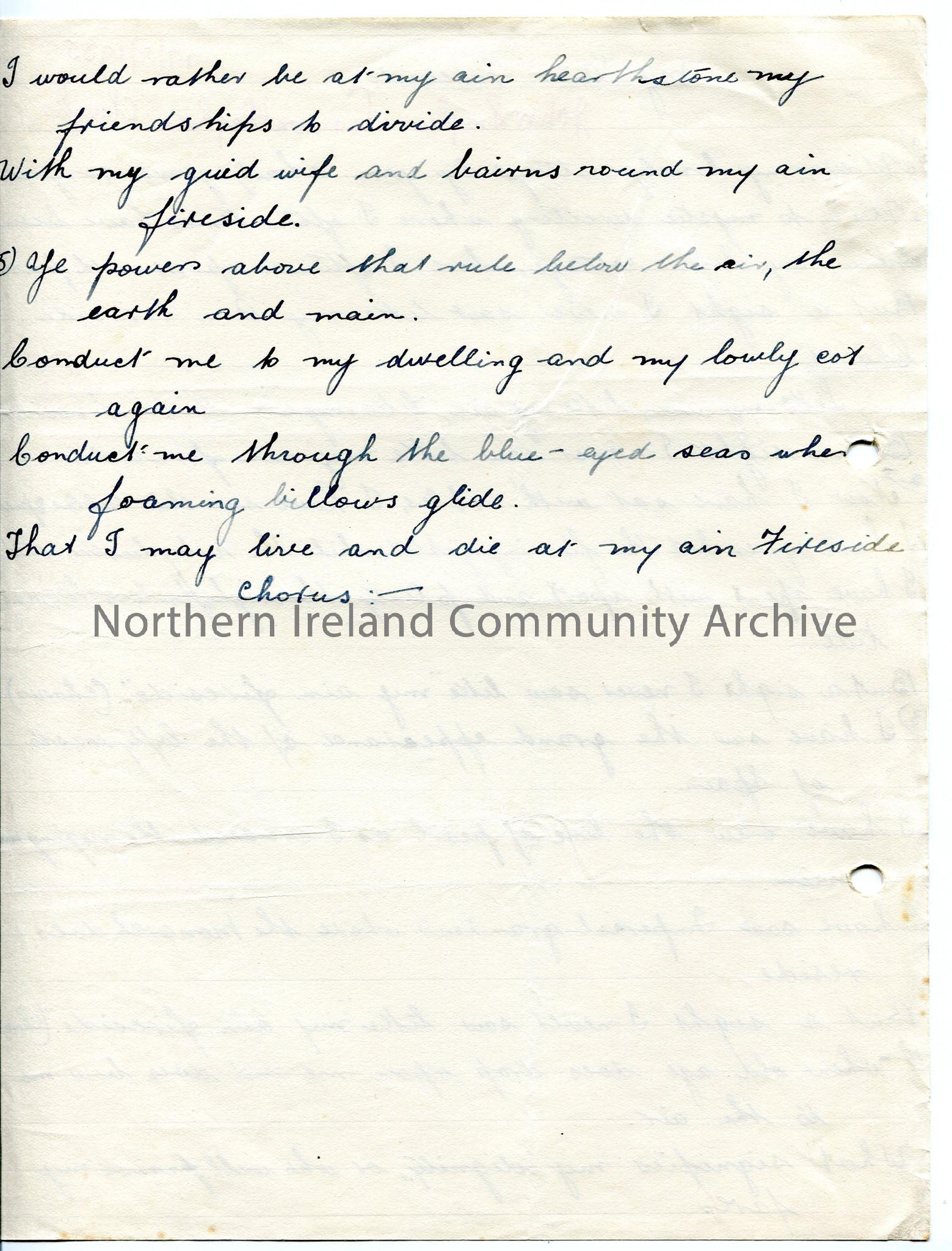 Handwritten words, on both sides, to ‘My ‘Ain’ Fireside’. Uses local dialect. – img774