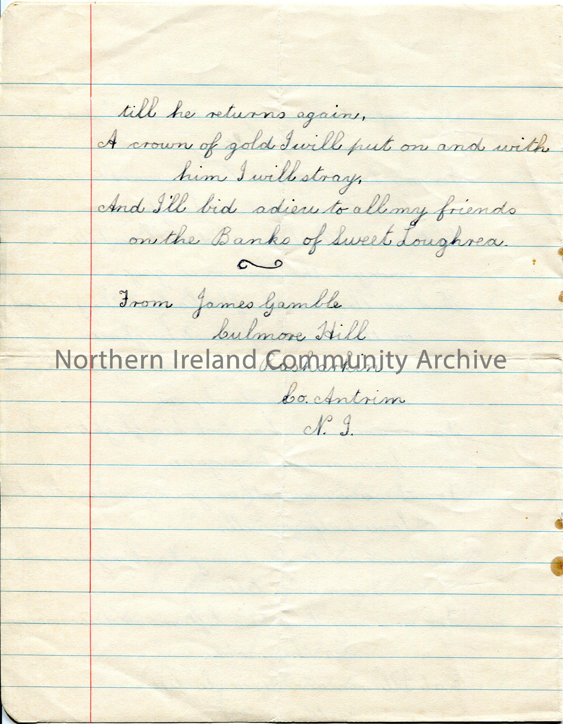 Handwritten words (page taken from a notebook and written on 3 sides) to song ‘The Banks of Sweet Loughrea’. From James Gamble, Culmore Hill, Rasharki… – scan015c