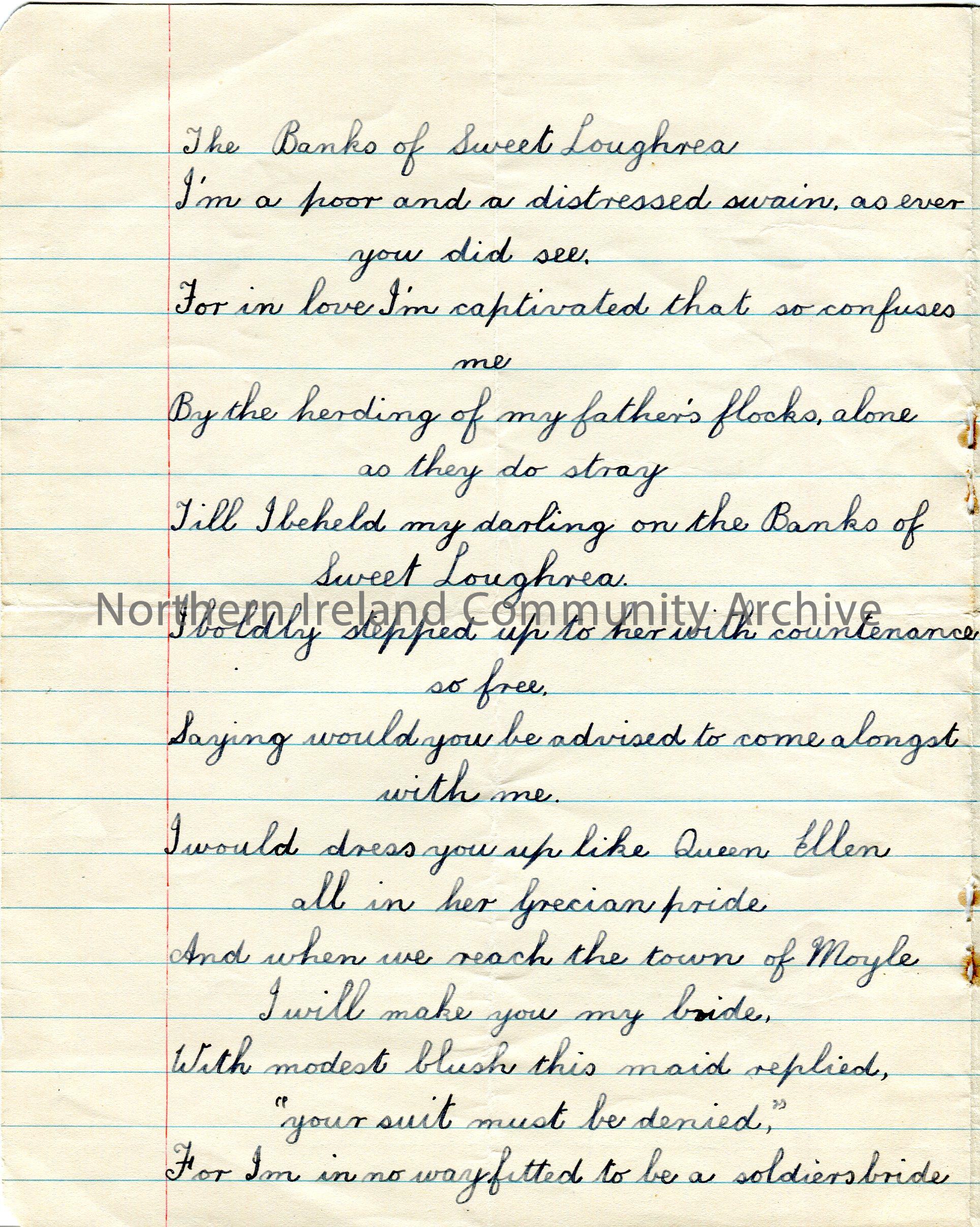 Handwritten words (page taken from a notebook and written on 3 sides) to song ‘The Banks of Sweet Loughrea’. From James Gamble, Culmore Hill, Rasharki…