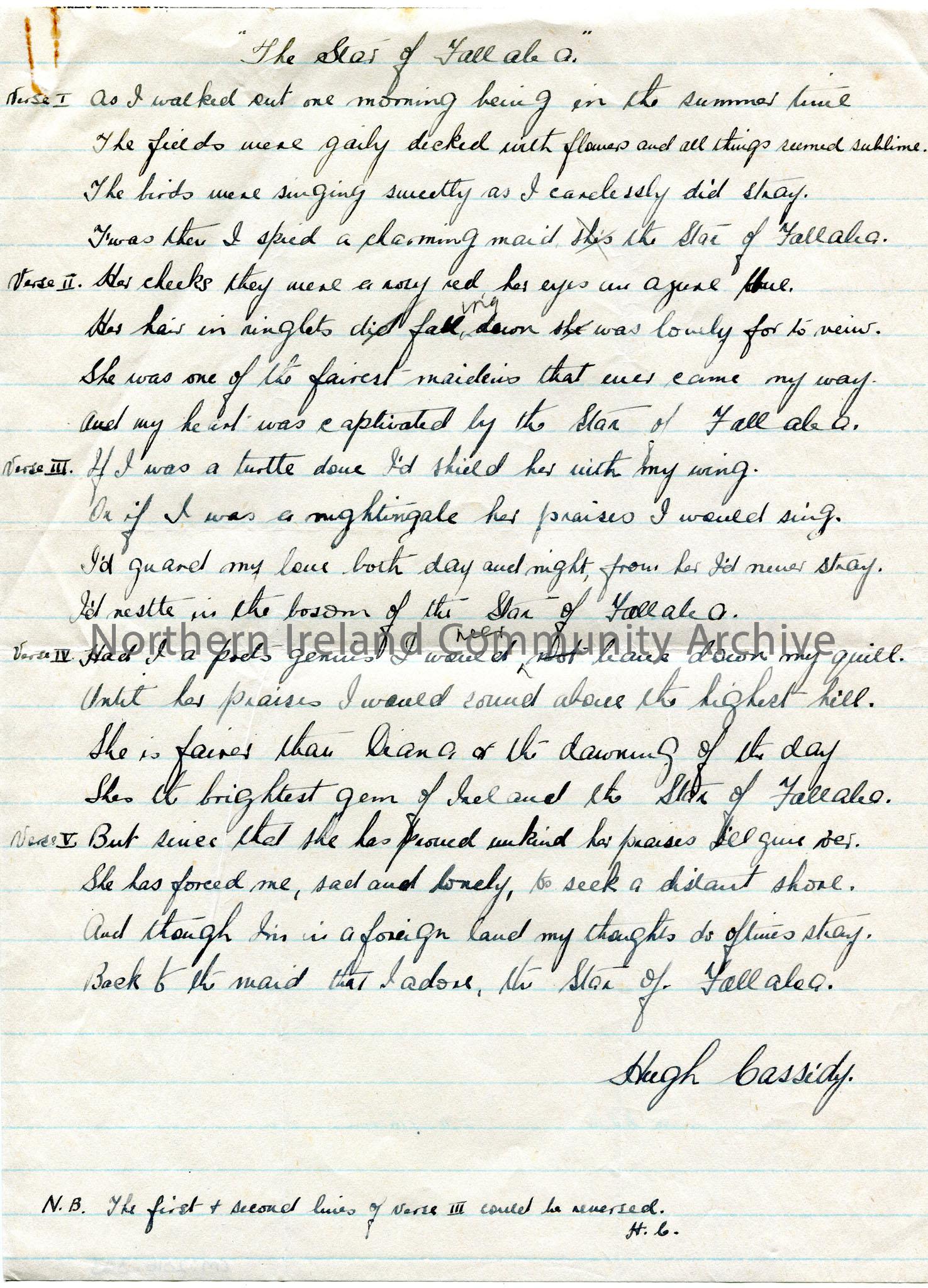 Handwritten words to a song titled, ‘The Star of Fallalea’, by Hugh Cassidy. Five Verses.