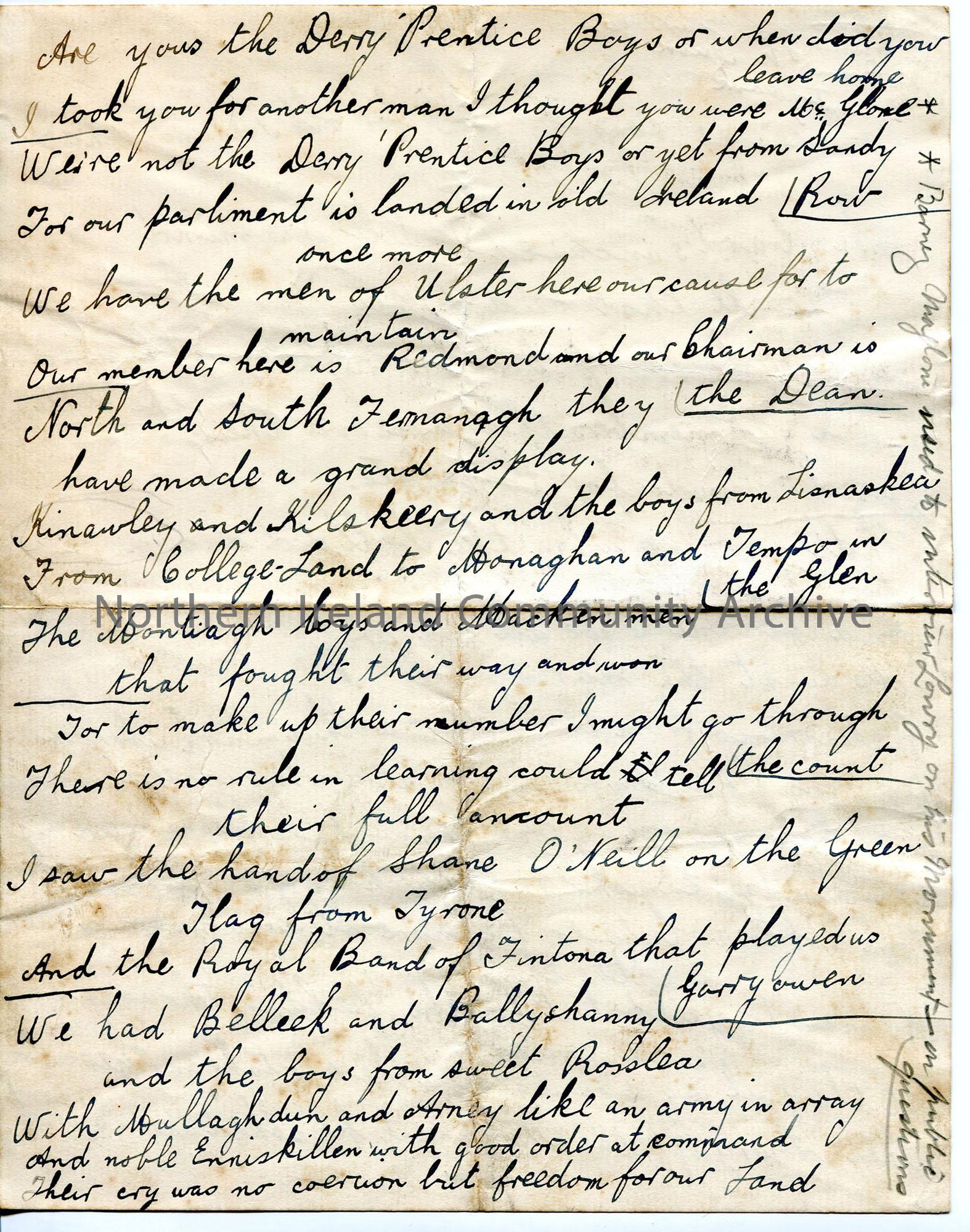 Handwritten words to ‘Enniskillen Land League Meeting’, with added side notes in pencil – ‘a ballad of 55 years ago’ – img945